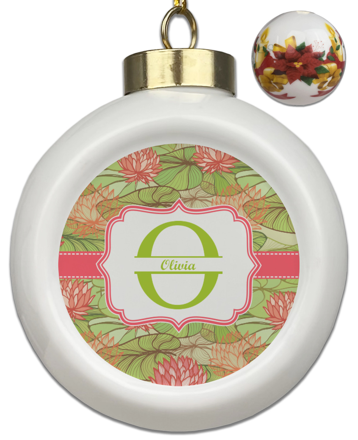 Our Christmas ornaments are a unique ceramic ball shape with a twist as it has a flat face to display your custom design! Select from one of our two design types - Christmas Tree or Poinsettia Garland - to adorn the curved back of your personal design. Each ornament measures 3H x 2.5W x 2D accompanied with a gold string accent for finishing touches to hang on your beautiful Christmas tree!