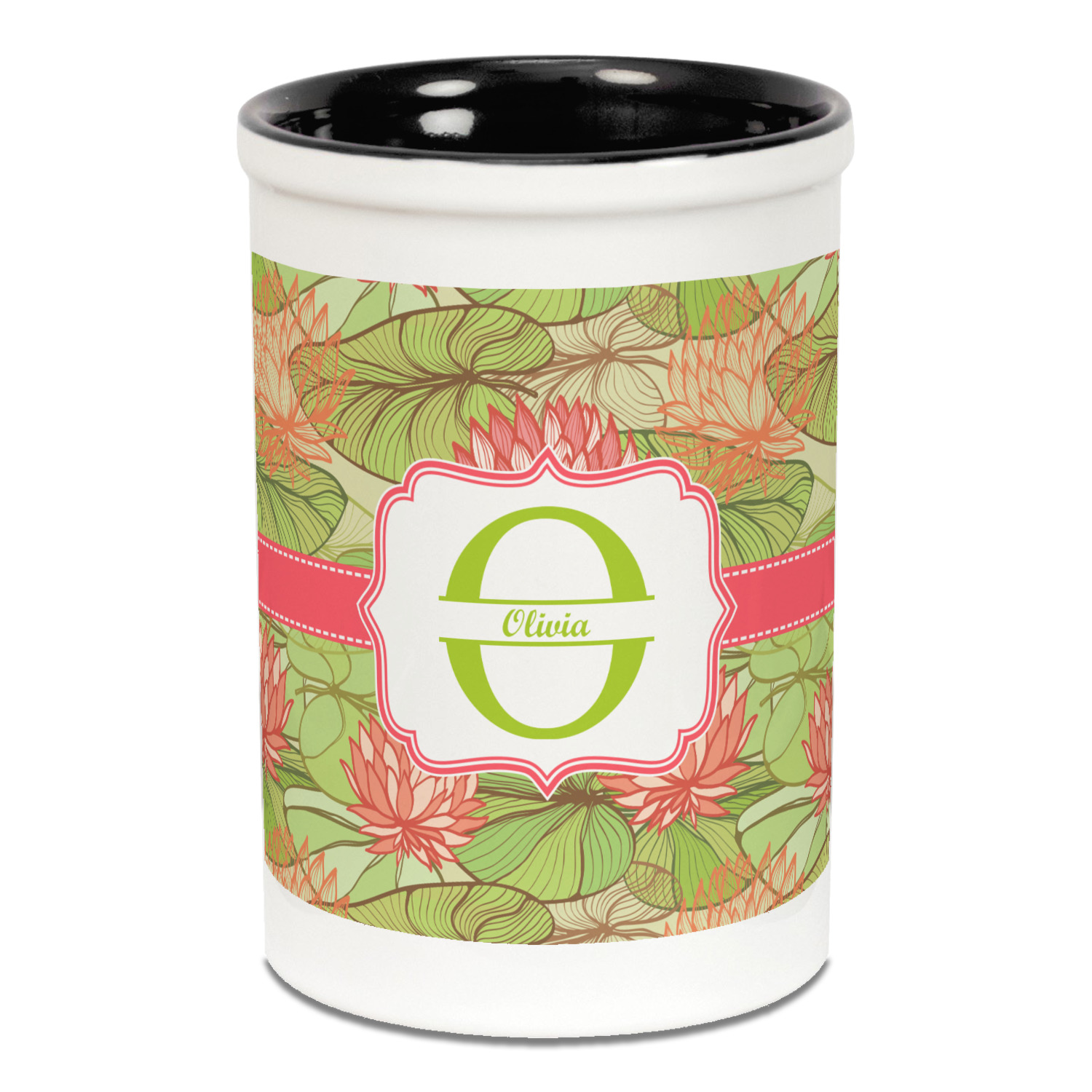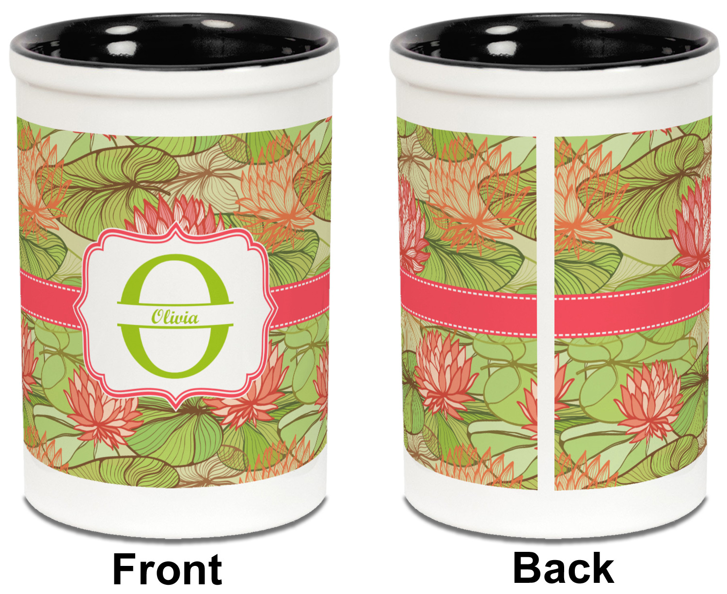 Both the blue and black pencil holders are a ceramic material, giving you a sturdy and long-lasting pen and pencil holder. We print your designs on the exterior of the pencil cup, covering most of the outside surface. There is a small white border on the top and bottom of the exterior of the pen holder, setting apart your design from the interior's color. Our ceramic pen caddy is roughly 3.5" x 3.5" x 5" in dimensions.