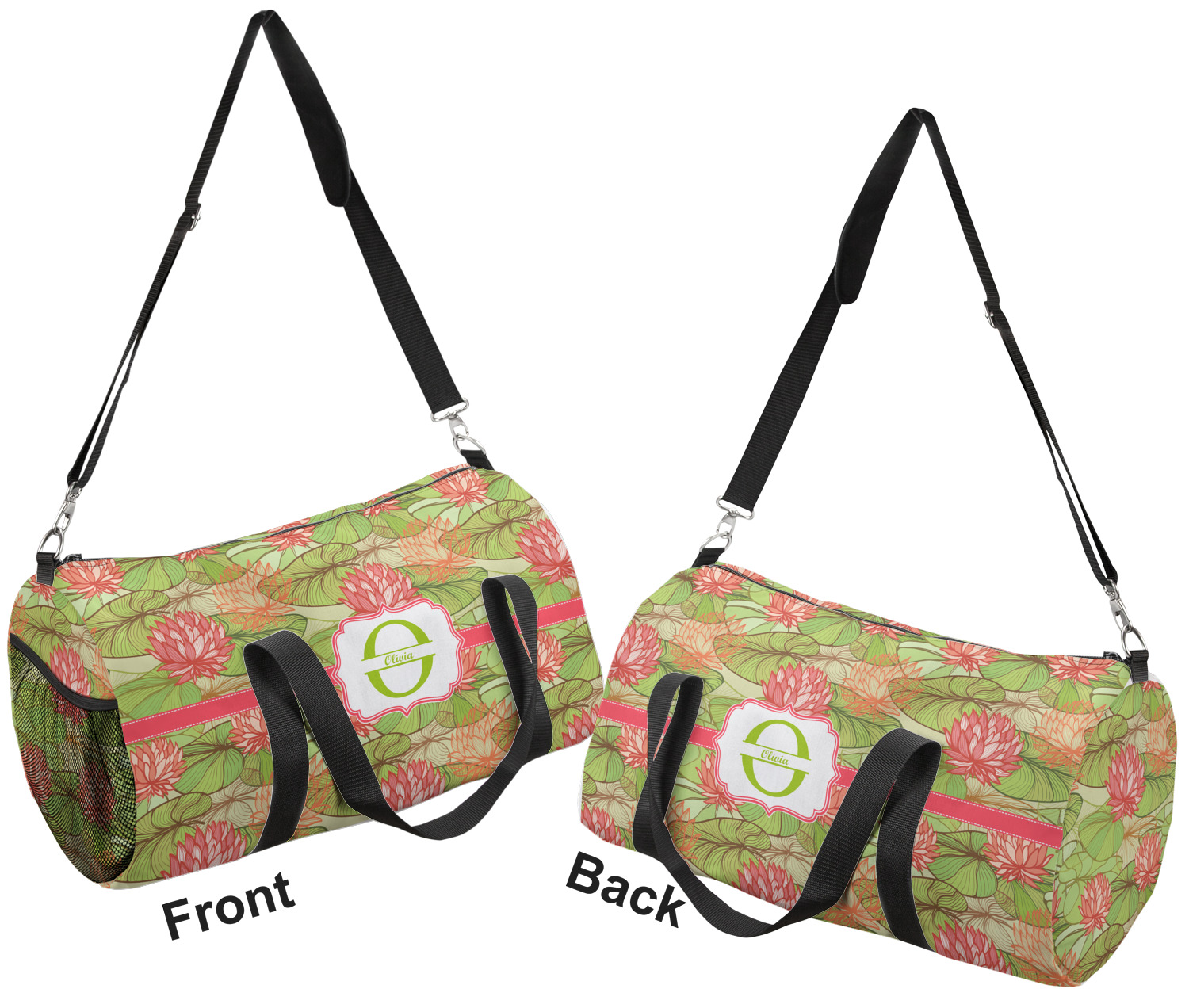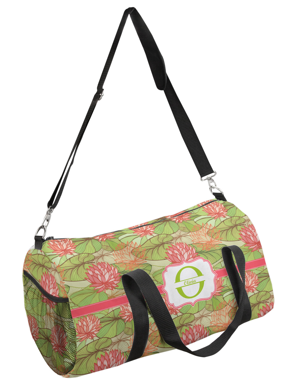 This duffle is a sturdy bag made of a canvas material. It comes in two sizes: Small (19"W x 9.5"H x 9.5"D) and Large (23"W x 12"H x 12"D). The bag is a cylindrical shape with a black adjustable strap and two handles. On one side is an elastic pouch to put a waterbottle or other small item. Your product will be sublimated with your design and is able to be designed on the front, back, and sides. Be sure to remember that the straps may cut into parts of your design if you upload your own artwork.