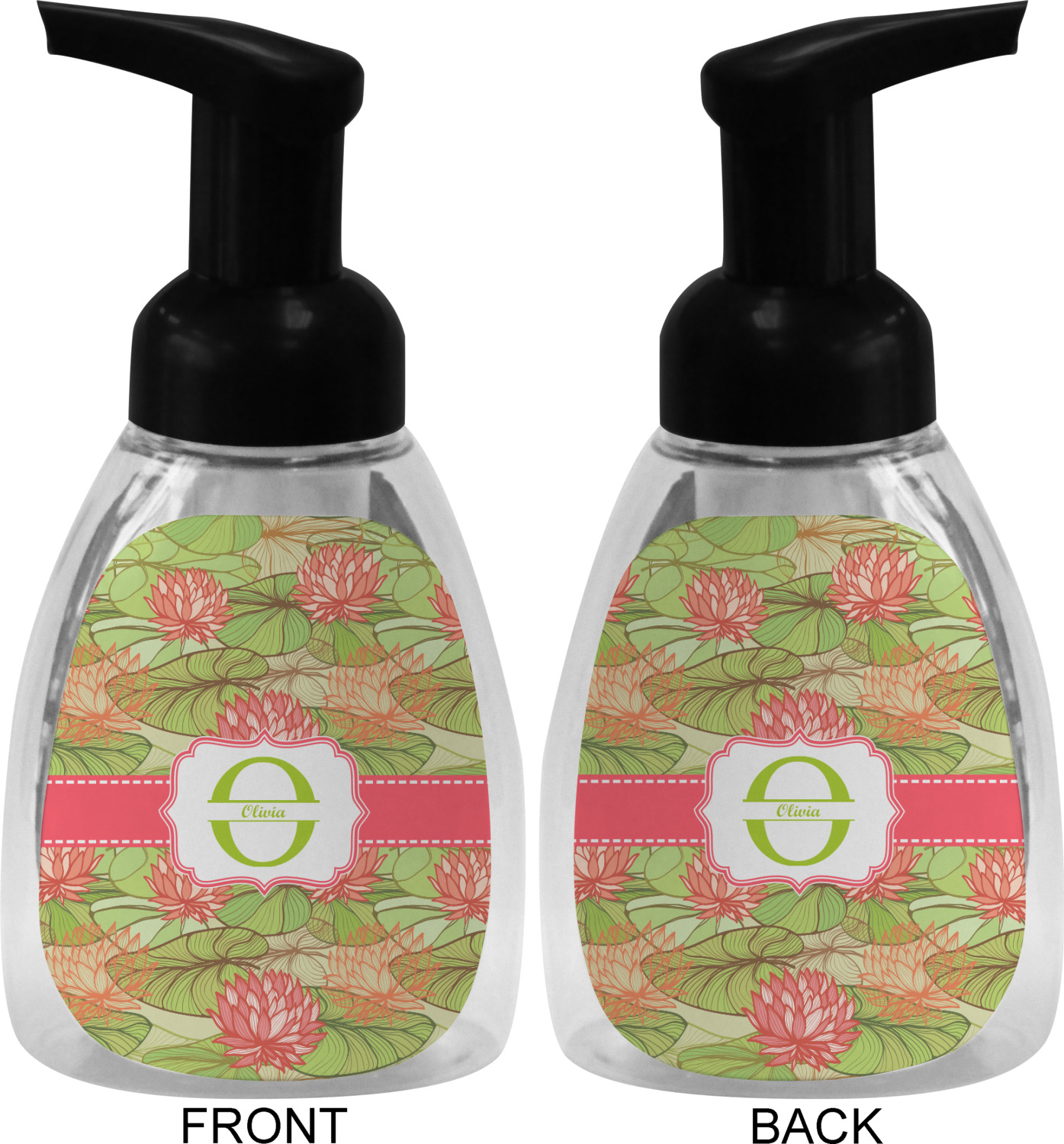 This soap dispenser is made of a robust plastic and has a clear base. The included soap pump is available in black or white color. This dispenser is 6.5 inches tall, 3 inches wide, and 2 inches deep. We display your customized designs on the front and back sides of these foaming hand soap dispensers.