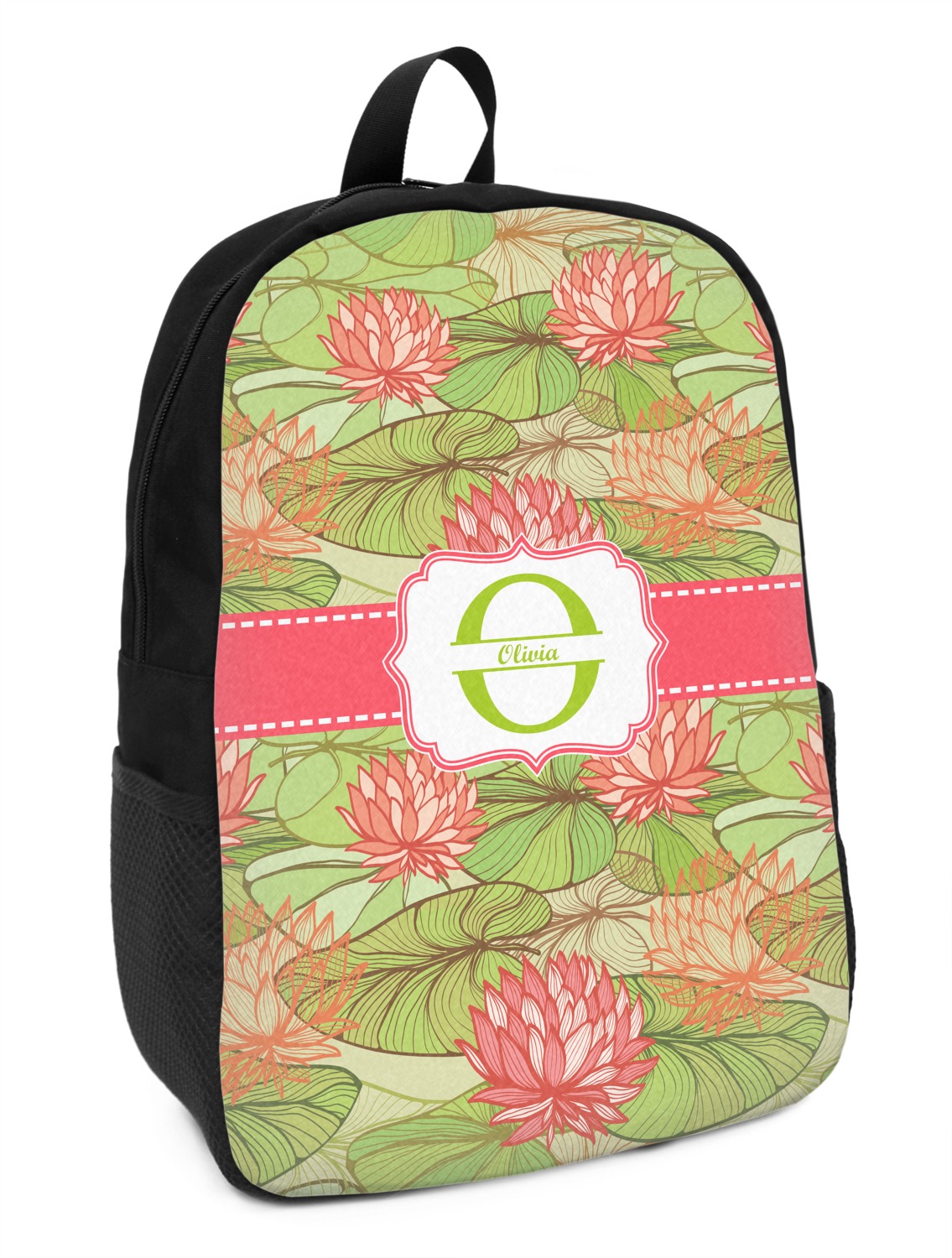 These small backpacks are made of a durable black canvas material with your personalization right on the front. The two shoulder straps are padded and easily adjustable. The bag itself measures at about 11" W x 15" H x 5" D. It's the perfect size for elementary aged kids or adults who want a smaller backpack. On the top of the bag you will find a handle to hang or carry your backpack by as well as a large zipper closure to keep all of your belongings safe inside. On each side of your backpack is a mesh pocket for a small item or water bottle. Inside your backpack you will find a spacious area with a small zipper pocket and a padded laptop slot that will fit up to a 13" laptop (13" being very snug). This is the perfect bag for any student that needs a couple books and their laptop with them at all times. It also works great as a carry on for traveling!