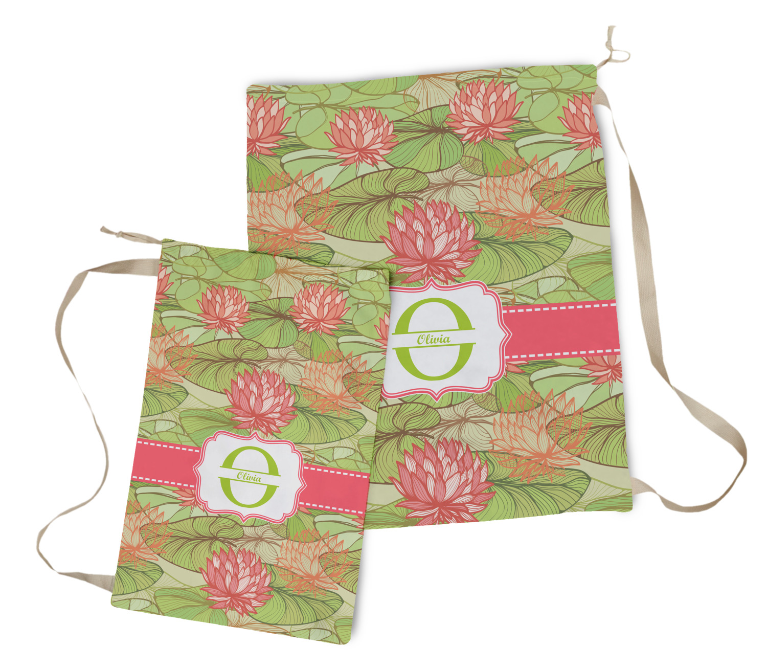 Carry your laundry in style with these customized laundry bags. Available in two sizes, featuring a natural colored woven strap and a cinch cord, these bags hold a lot of clothes or anything else you want to fit in them.
