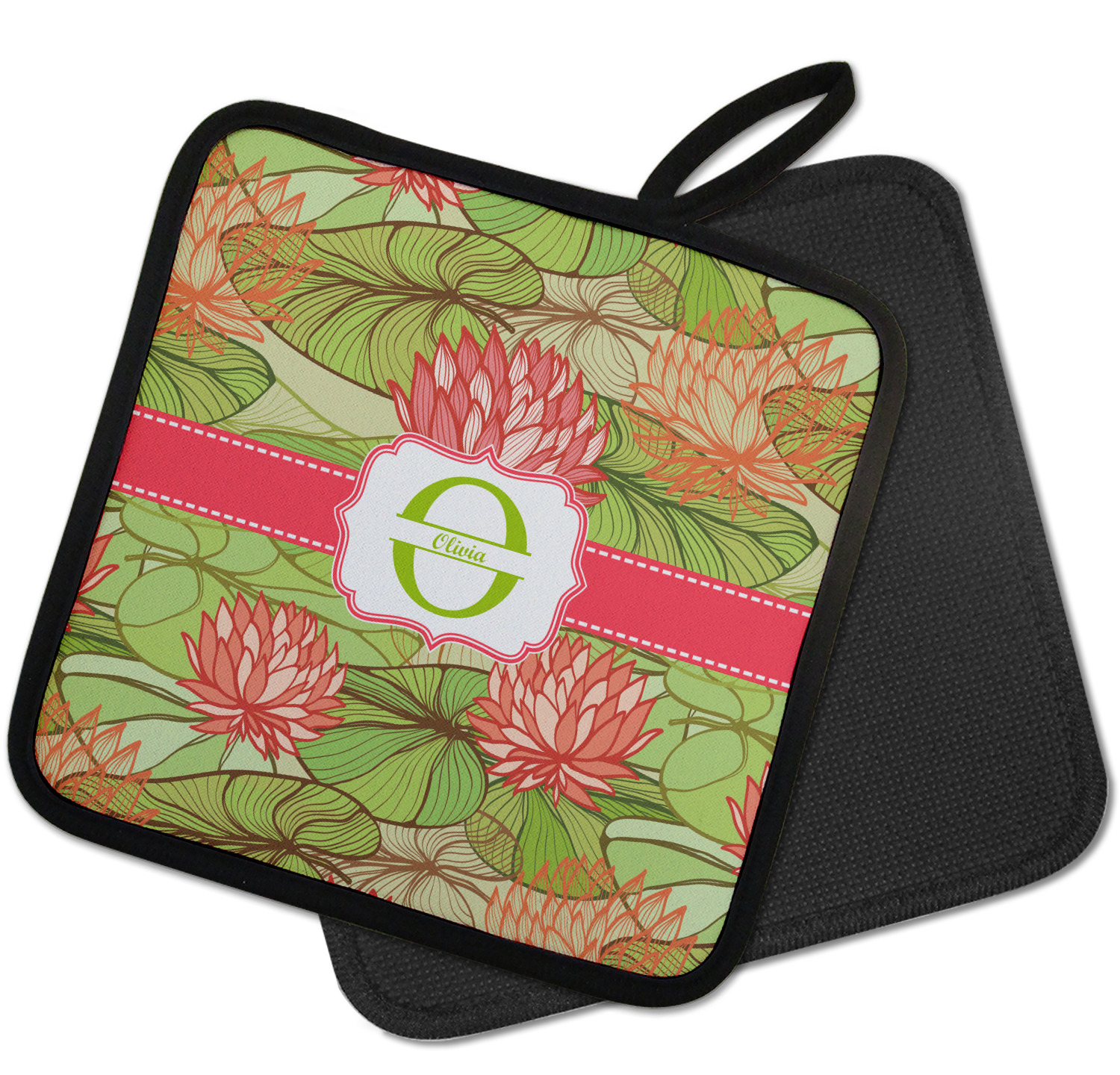 Our personalized pot holders feature a neoprene front that displays your personalization in vibrant colors. The backing of the hot pot holder is rubberized; the textured backing allows you to have a great grip when using this custom pot holder. The two materials are joined with a sleek, black trim, and the holder also includes an attached loop for hanging and storage. The pot holder is approximately 8.75 inches by 8.75 inches and 0.25 inches tall, while the fabric loop is 2.5 inches long. You can purchase a kitchen pot holder by itself or as a set of 2. We also offer a set including one pot holder and one oven mitt.