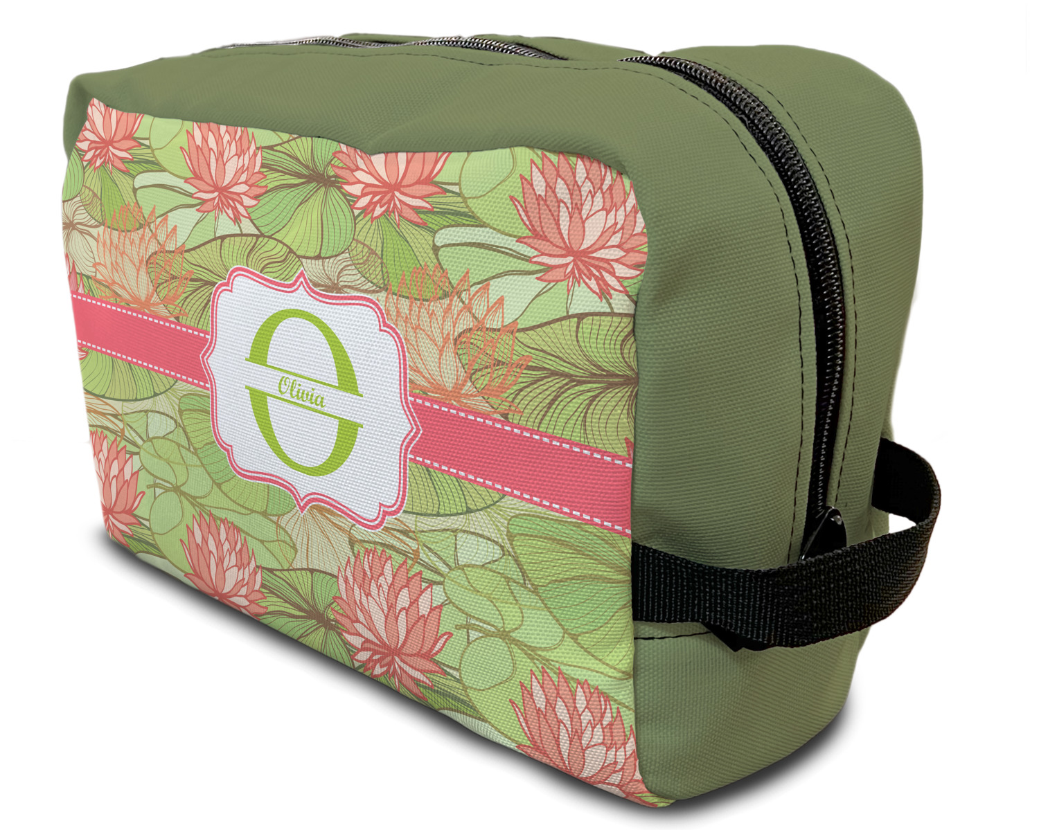 Our toiletry bag has the traditional dopp kit design i.e. a side to side zippered closure, giving you easy access to all the contents inside and a sturdy handle on one side of the bag. The canvas fabric for dopp kits is printed, then cut and sewn here in the USA.