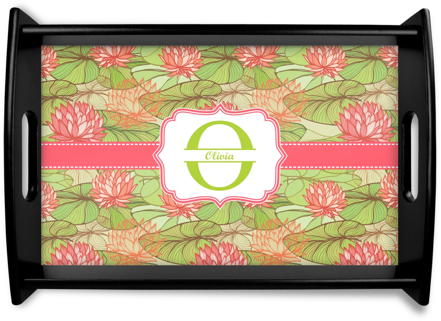 This serving tray with handles features square edges and two rounded sides, creating a very modern look. Each side is fabricated from a beautifully cut, natural wood. The bottom of the interior of the tray displays your customized design in bright, vibrant color. The tray is sold in both a black color and a natural wood look. Each variation of the wood serving tray has two sizes: Small, which is 14" x 10" x 2.25", and Large, which is 19.5" x 13.5" x 2.75".