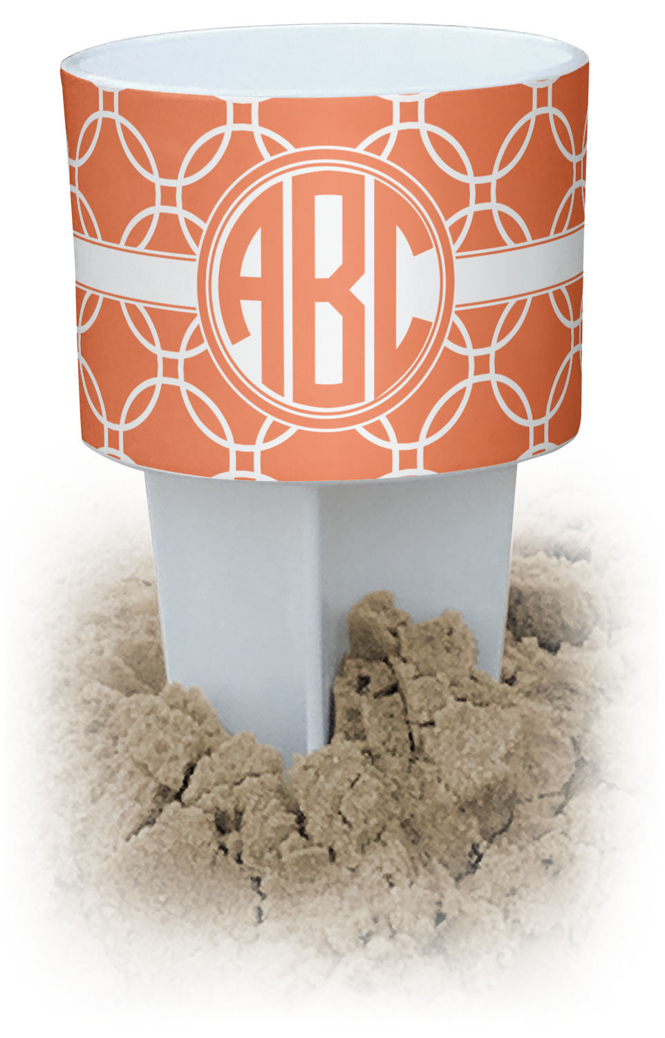 This cup holder has a large stake at its bottom that anchors it to the sand or ground below, while the cup holder rests above the stake. The entire drink holder is made of durable plastic and displays your customization around the cup holder portion. We sell these personalized beach spikers in two different colors: black and white.