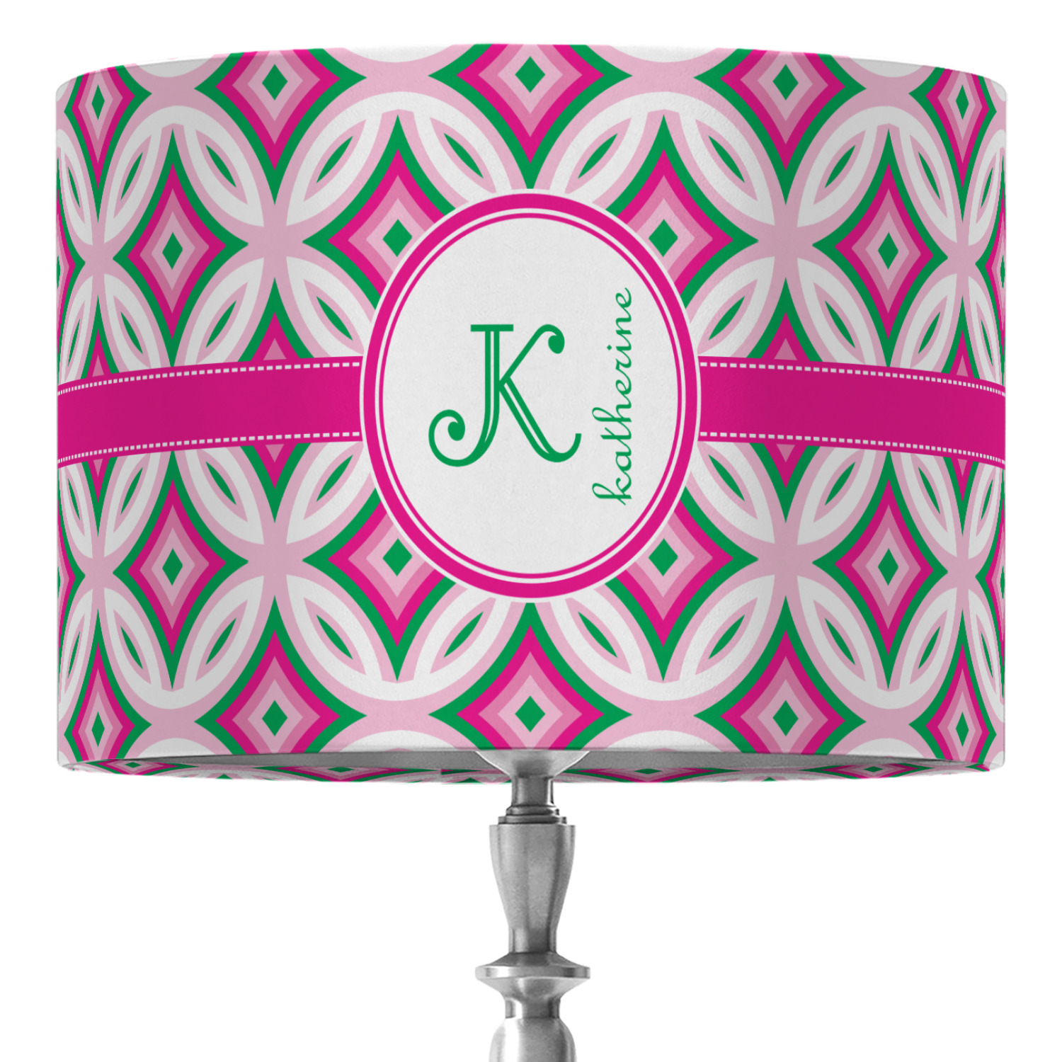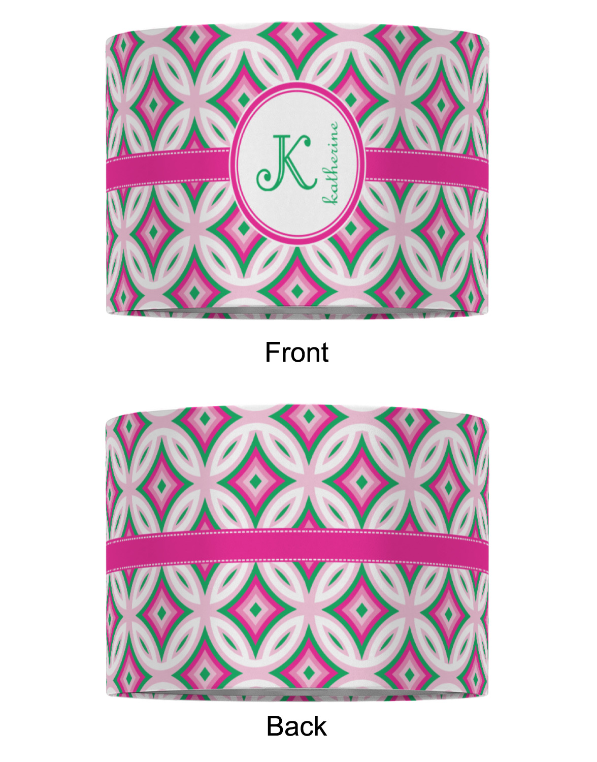 If you are looking for a design that is both girly and graphic, you will love Linked Circles & Diamonds Design. This design's color scheme is composed of light pink, hot pink, green and white. The pattern is exactly what the name implies circles and diamond intertwined through the whole design. Through the center there is label and ribbon shown in hot pink, but the color can be modified.