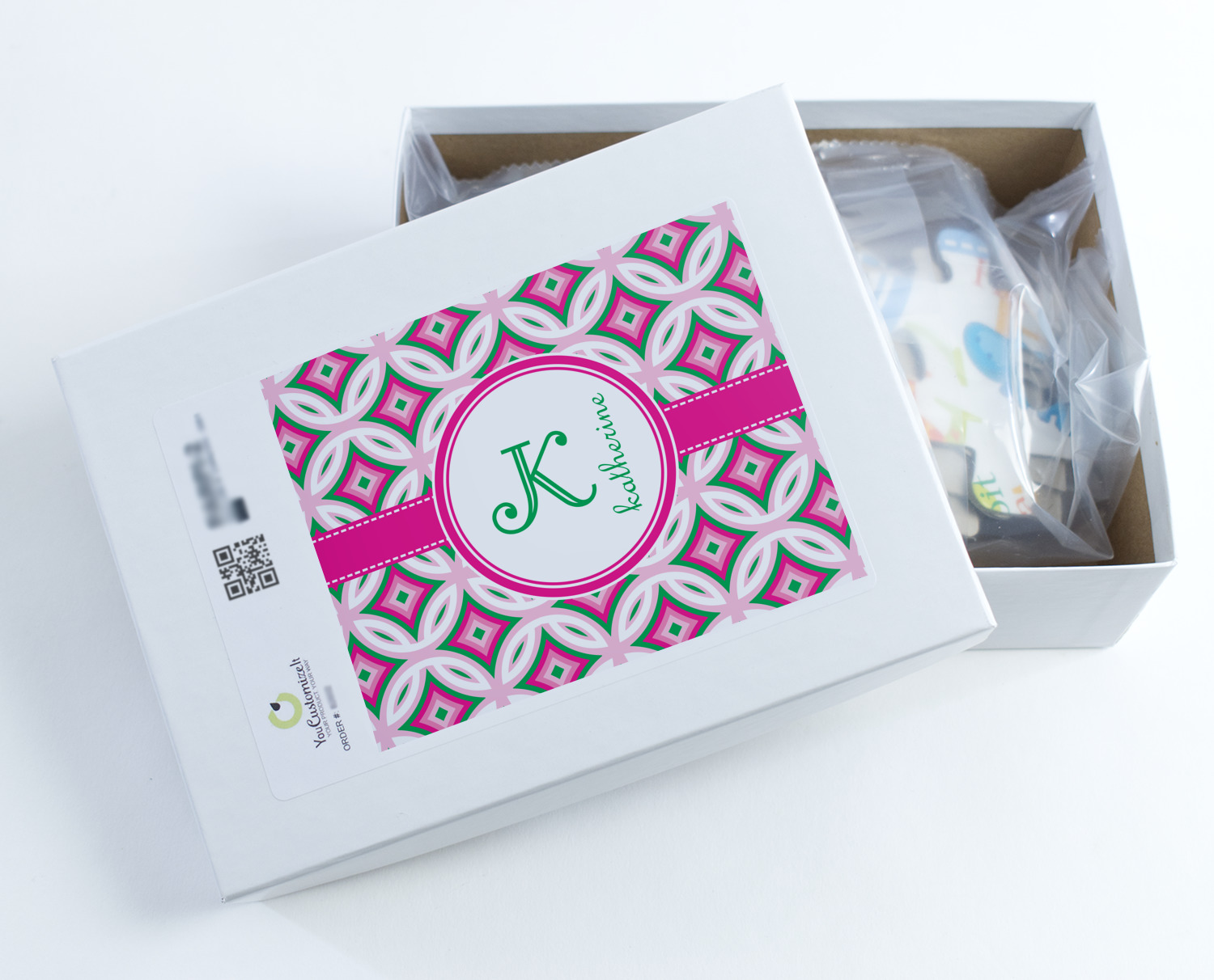 If you are looking for a design that is both girly and graphic, you will love Linked Circles & Diamonds Design. This design's color scheme is composed of light pink, hot pink, green and white. The pattern is exactly what the name implies circles and diamond intertwined through the whole design. Through the center there is label and ribbon shown in hot pink, but the color can be modified.