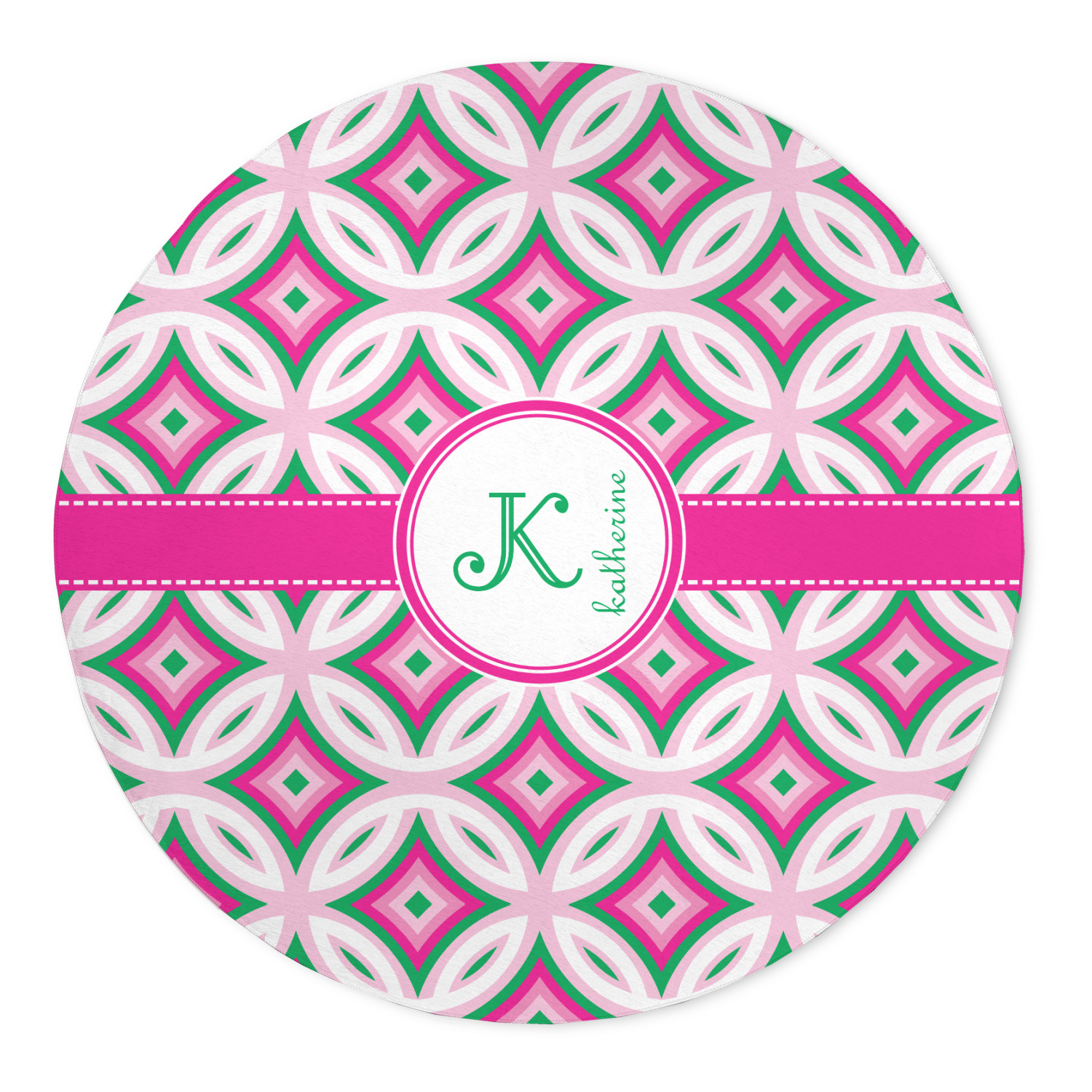 If you are looking for a design that is both girly and graphic, you will love Linked Circles & Diamonds Design. This design's color scheme is composed of light pink, hot pink, green and white. The pattern is exactly what the name implies circles and diamond intertwined through the whole design. Through the center there is label and ribbon shown in hot pink, but the color can be modified.