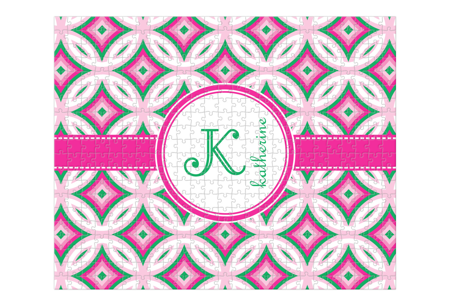 If you are looking for a design that is both girly and graphic, you will love Linked Circles & Diamonds Design. This design's color scheme is composed of light pink, hot pink, green and white. The pattern is exactly what the name implies circles and diamond intertwined through the whole design. Through the center there is label and ribbon shown in hot pink, but the color can be modified.