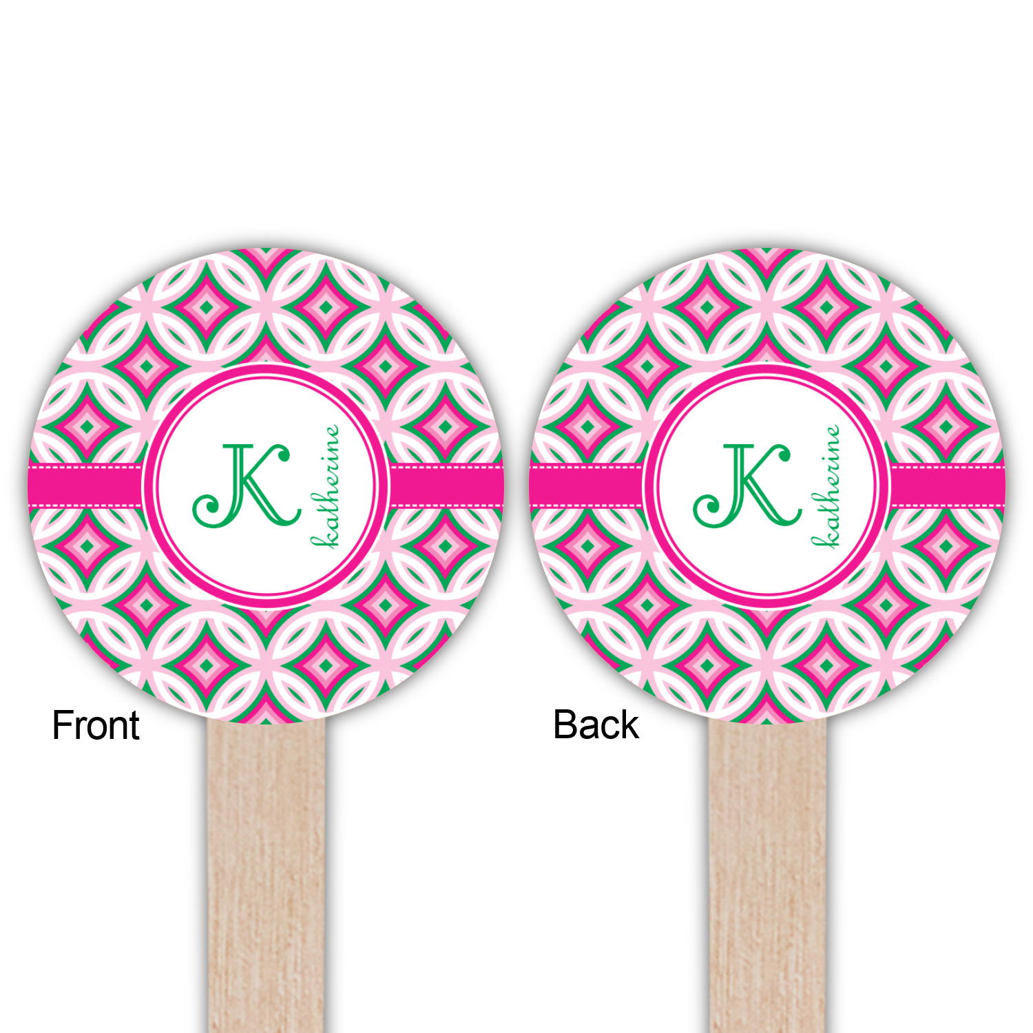 If you are looking for a design that is both girly and graphic, you will love Linked Circles & Diamonds Design. This design's color scheme is composed of light pink, hot pink, green and white. The pattern is exactly what the name implies circles and diamond intertwined through the whole design. Through the center there is label and ribbon shown in hot pink, but the color can be modified.