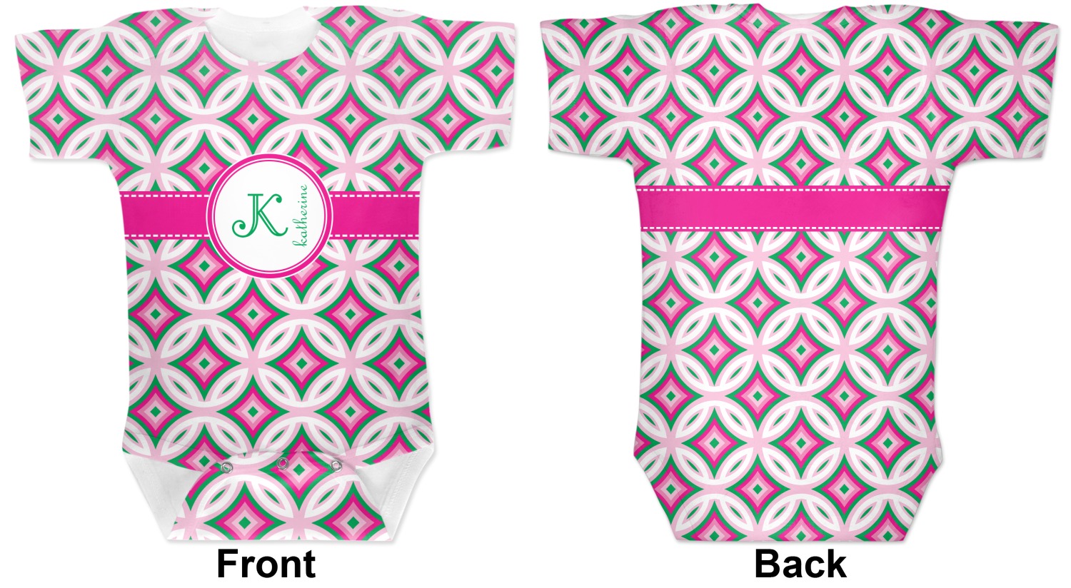 If you are looking for a design that is both girly and graphic, you will love Linked Circles & Diamonds Design. This design's color scheme is composed of light pink, hot pink, green and white. The pattern is exactly what the name implies circles and diamond intertwined through the whole design. Through the center there is label and ribbon shown in hot pink, but the color can be modified.