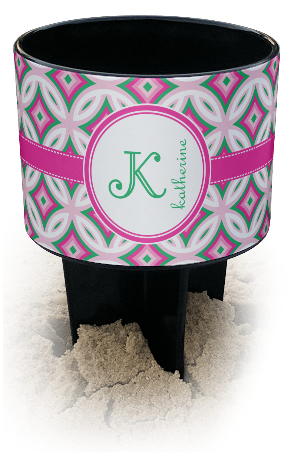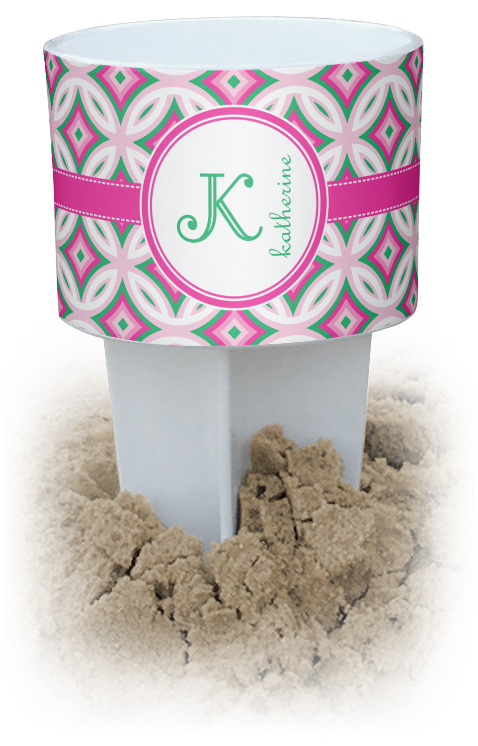 This cup holder has a large stake at its bottom that anchors it to the sand or ground below, while the cup holder rests above the stake. The entire drink holder is made of durable plastic and displays your customization around the cup holder portion. We sell these personalized beach spikers in two different colors: black and white.