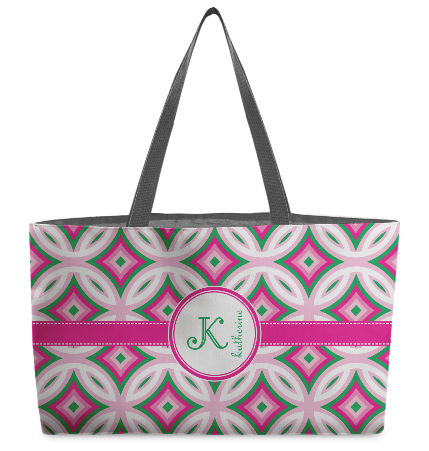 These beach totes are handmade here in the USA. Fabric is printed with your design. The tote is then sewn from the fabric pieces, lining and handles added.