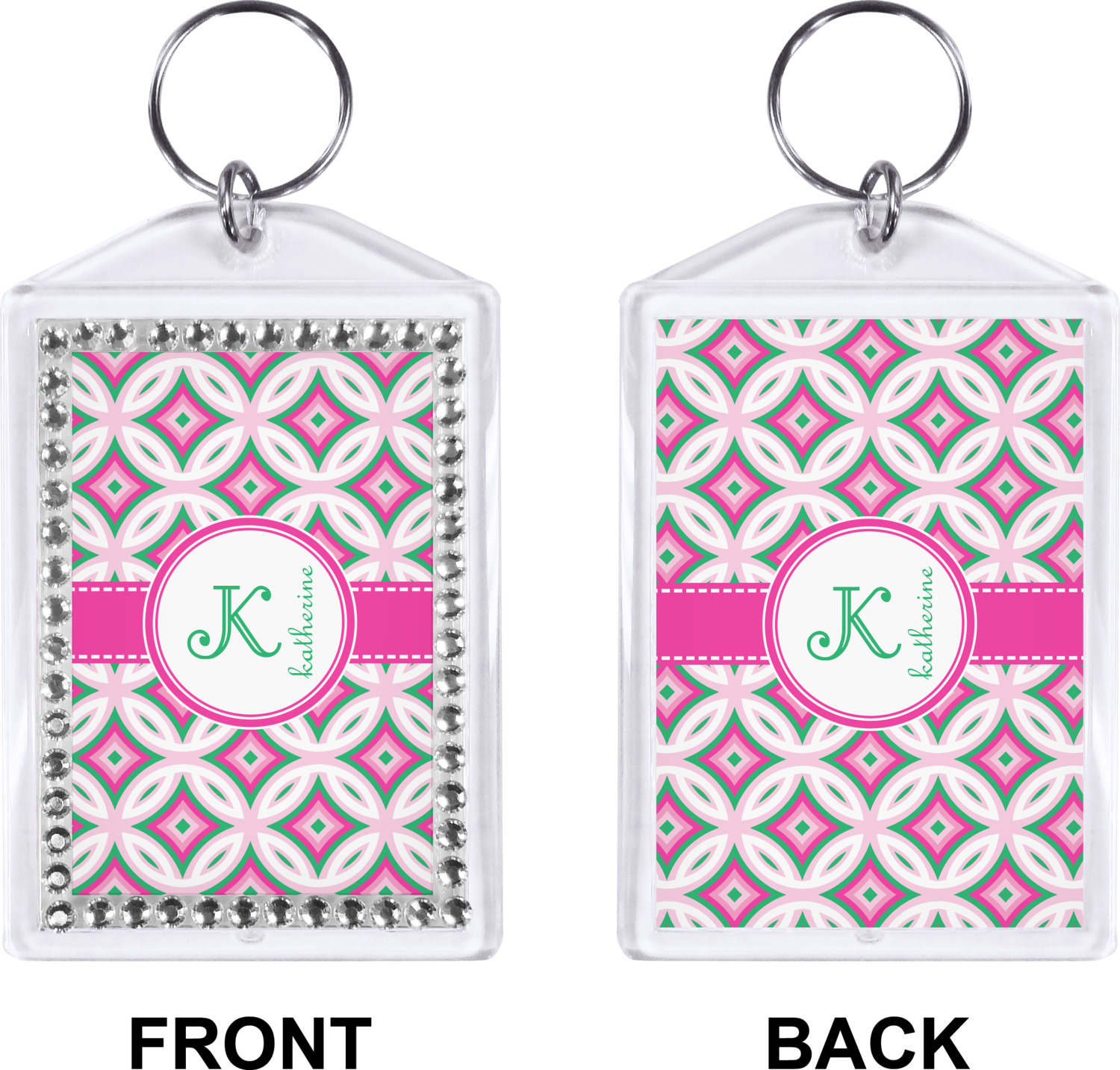 Our personalized keychains have a bold, rectangular shape, outlined by a series of shimmering rhinestones. A metal, split keyring is included with your purchase, and an additional metal hoop allows for attachment of the keychain to the split ring. This unique keychain measures at about 3.75 by 2.5 inches. We print your customized design(s) across both the back and front of this keychain.