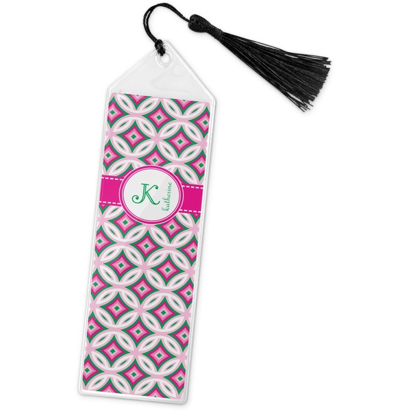 Your personalized bookmark is made of a sturdy, clear vinyl, and is approximately 7.5" x 2.25". We display your personalization on vinyl inserts that are placed on both sides. Accompanying each book marker is a black, fringe tassel that attaches to the reinforced, triangular header.