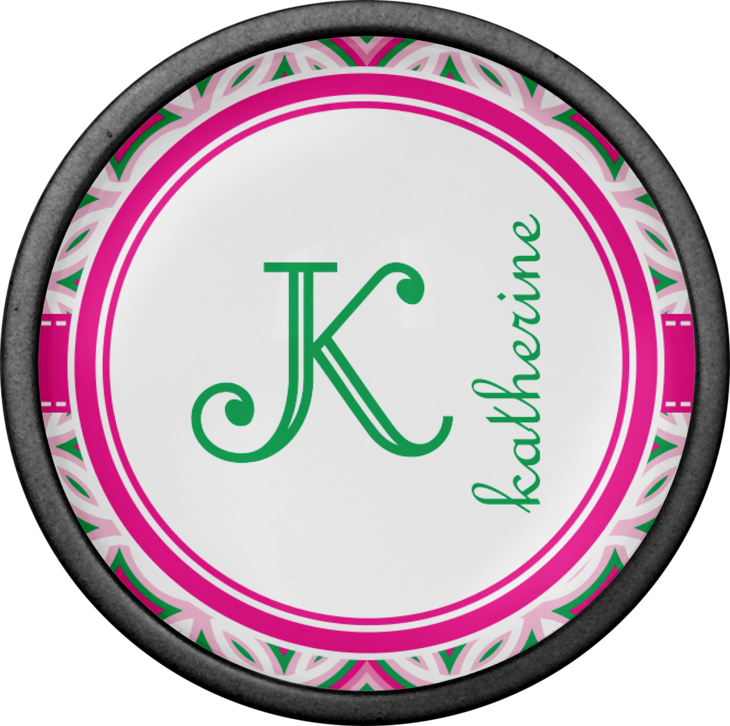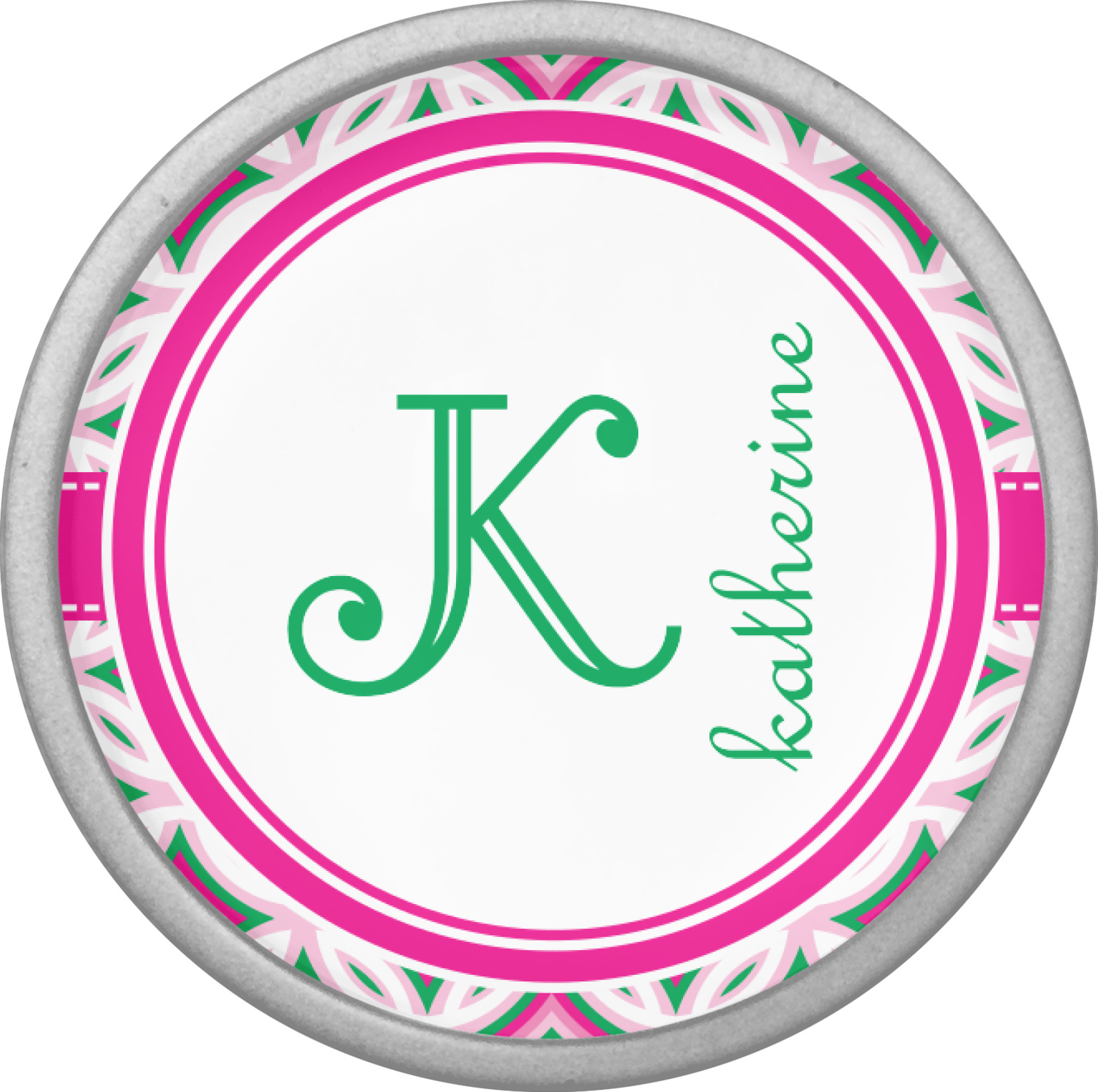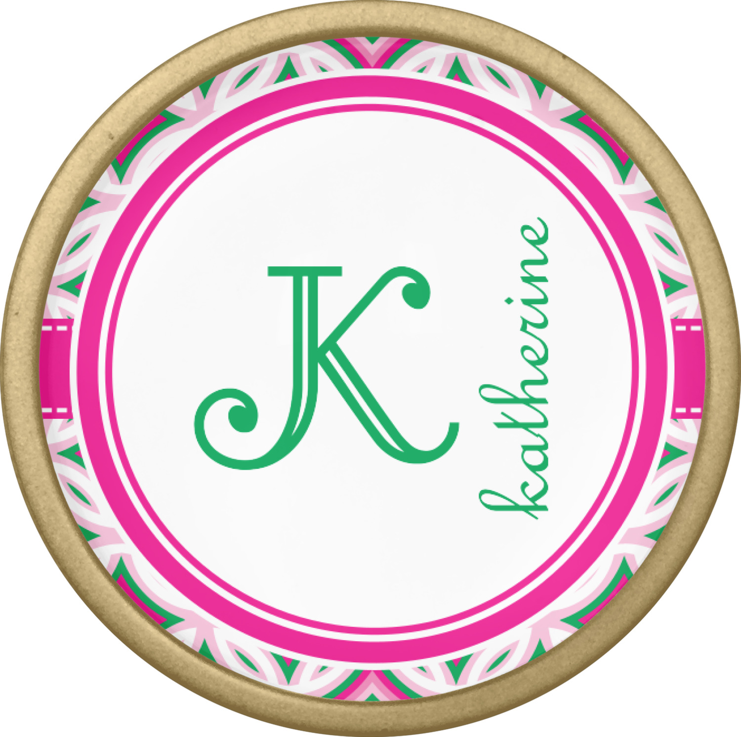 If you are looking for a design that is both girly and graphic, you will love Linked Circles & Diamonds Design. This design's color scheme is composed of light pink, hot pink, green and white. The pattern is exactly what the name implies circles and diamond intertwined through the whole design. Through the center there is label and ribbon shown in hot pink, but the color can be modified.