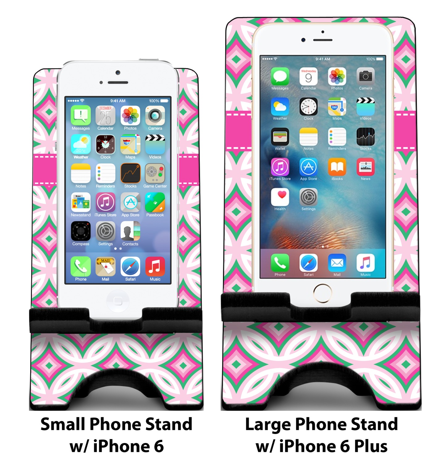 To meet your needs, we offer four variations of this IPhone stand. The backboard of the first version is shaped as a plain, yet sleek rectangle, and is available in two sizes. Our smaller size is approximately 4 by 3.25 by 7 inches, while the larger model is 4 by 3.77 by 8.5 inches. Alongside this model, we also provide you with a more decorative option. The upper part of our second version features a curved edge, for a classy, suave appearance. This phone holder is also sold in two sizes: a smaller version, which is 4 by 3.25 by 7 inches, and our larger model, which is 4 by 3.77 by 8.5 inches. Both models will support large phones, but the larger model is better if you wish to proudly display your personalized design.