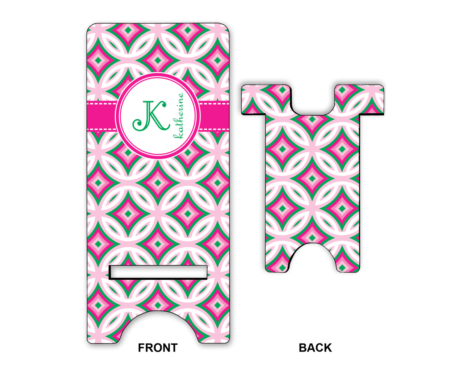 If you are looking for a design that is both girly and graphic, you will love Linked Circles & Diamonds Design. This design's color scheme is composed of light pink, hot pink, green and white. The pattern is exactly what the name implies circles and diamond intertwined through the whole design. Through the center there is label and ribbon shown in hot pink, but the color can be modified.