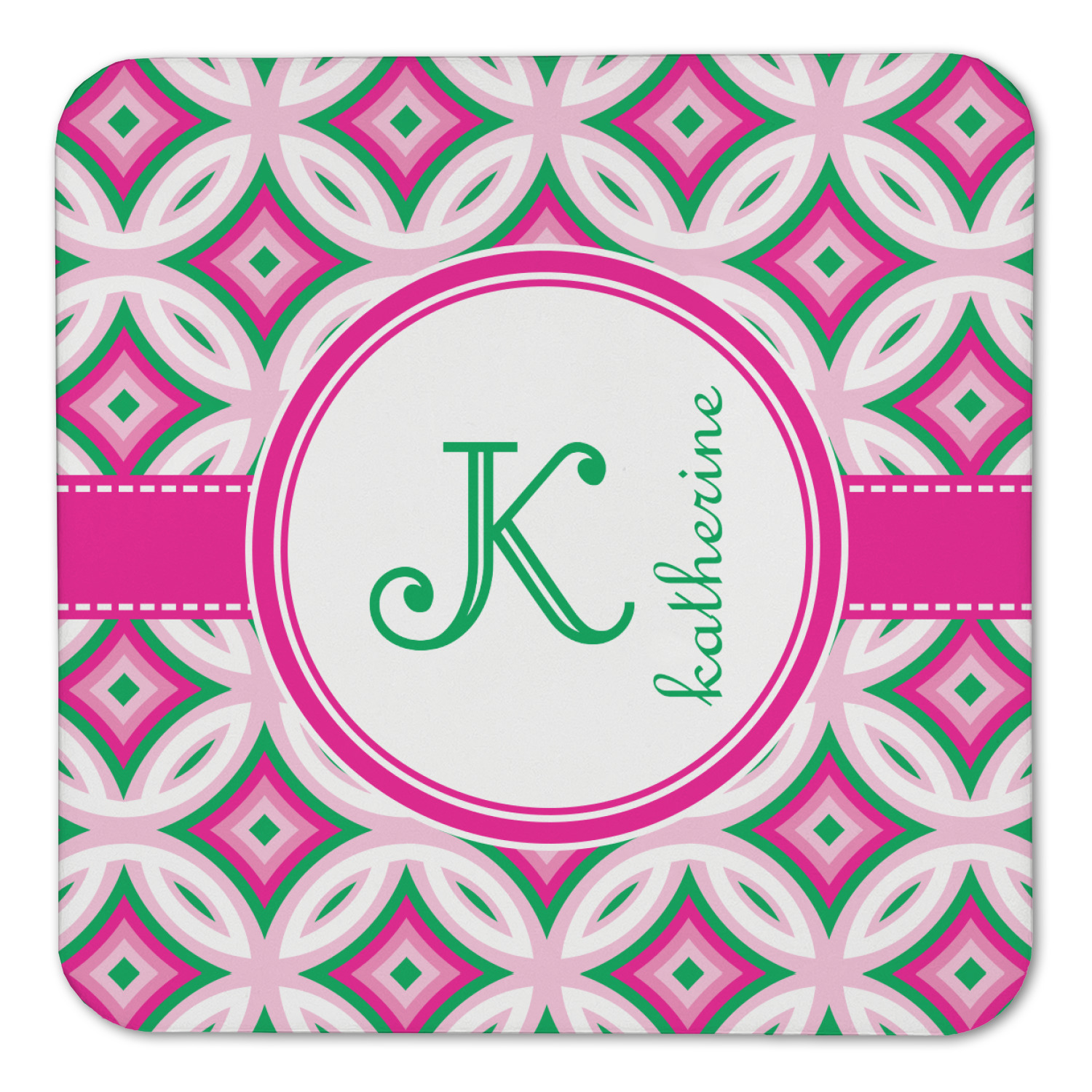 If you are looking for a design that is both girly and graphic, you will love Linked Circles & Diamonds Design. This design's color scheme is composed of light pink, hot pink, green and white. The pattern is exactly what the name implies circles and diamond intertwined through the whole design. Through the center there is label and ribbon shown in hot pink, but the color can be modified.