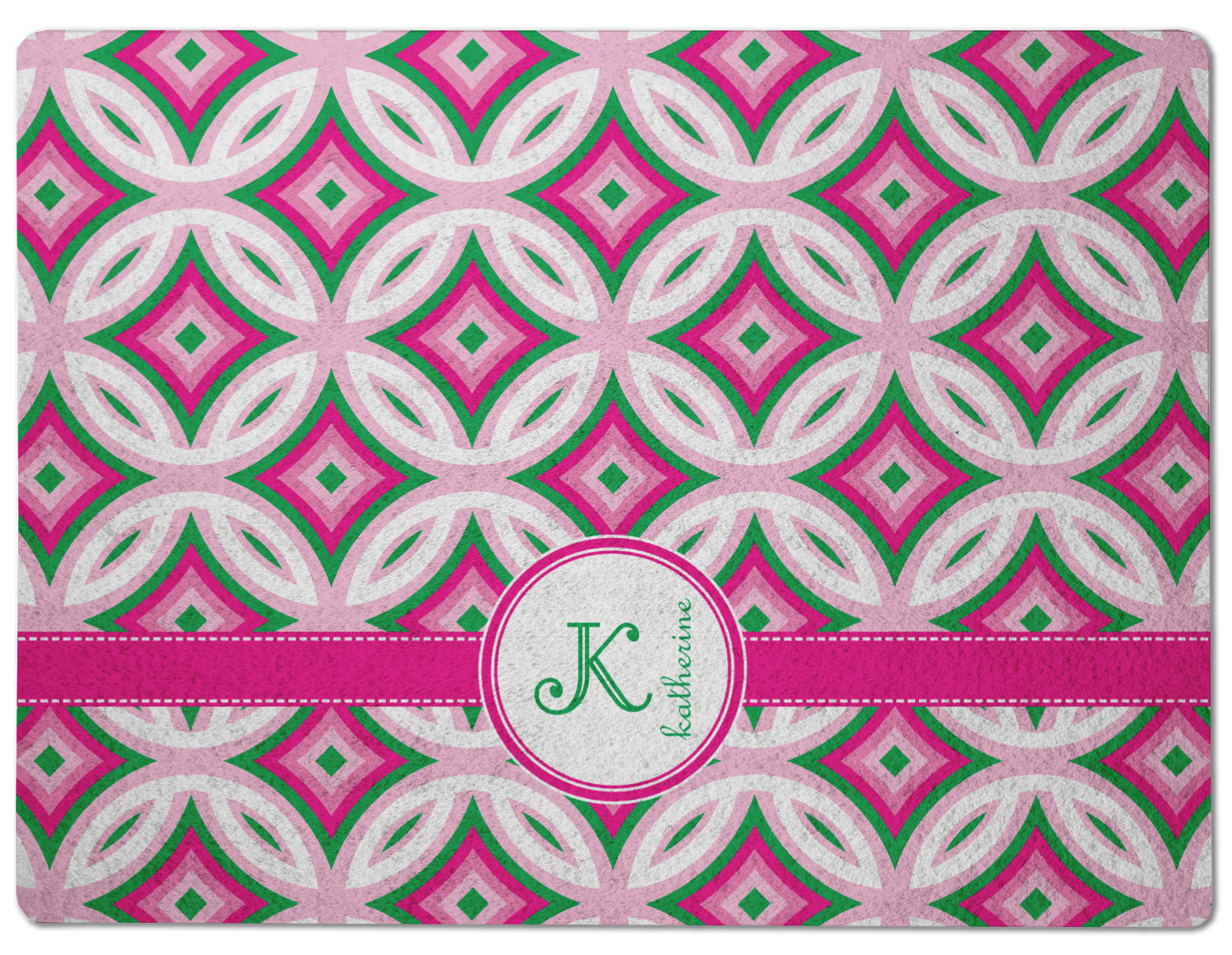 If you are looking for a design that is both girly and graphic, you will love Linked Circles & Diamonds Design. This design's color scheme is composed of light pink, hot pink, green and white. The pattern is exactly what the name implies circles and diamond intertwined through the whole design. Through the center there is label and ribbon shown in hot pink, but the color can be modified.
