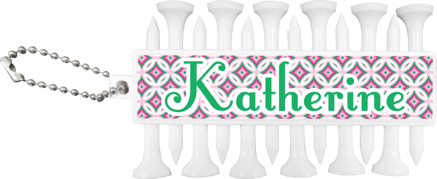 With 12 tees on a lightweight, portable key chain, it almost ensures a great 18 holes. Our tees are made of white plastic and are a little over 2". Design the front and the back of the golf tee holder. Pick from over a hundred designs, colors, and personalization styles! The set even comes with three removable ball markers as well!