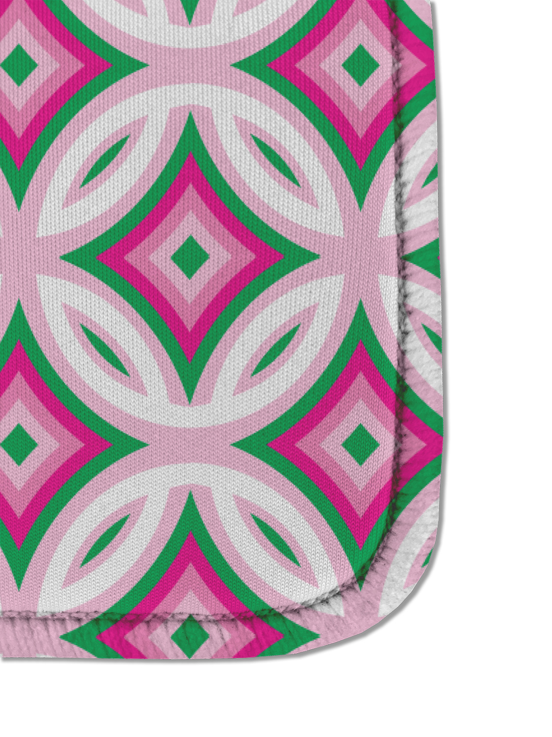 If you are looking for a design that is both girly and graphic, you will love Linked Circles & Diamonds Design. This design's color scheme is composed of light pink, hot pink, green and white. The pattern is exactly what the name implies circles and diamond intertwined through the whole design. Through the center there is label and ribbon shown in hot pink, but the color can be modified.