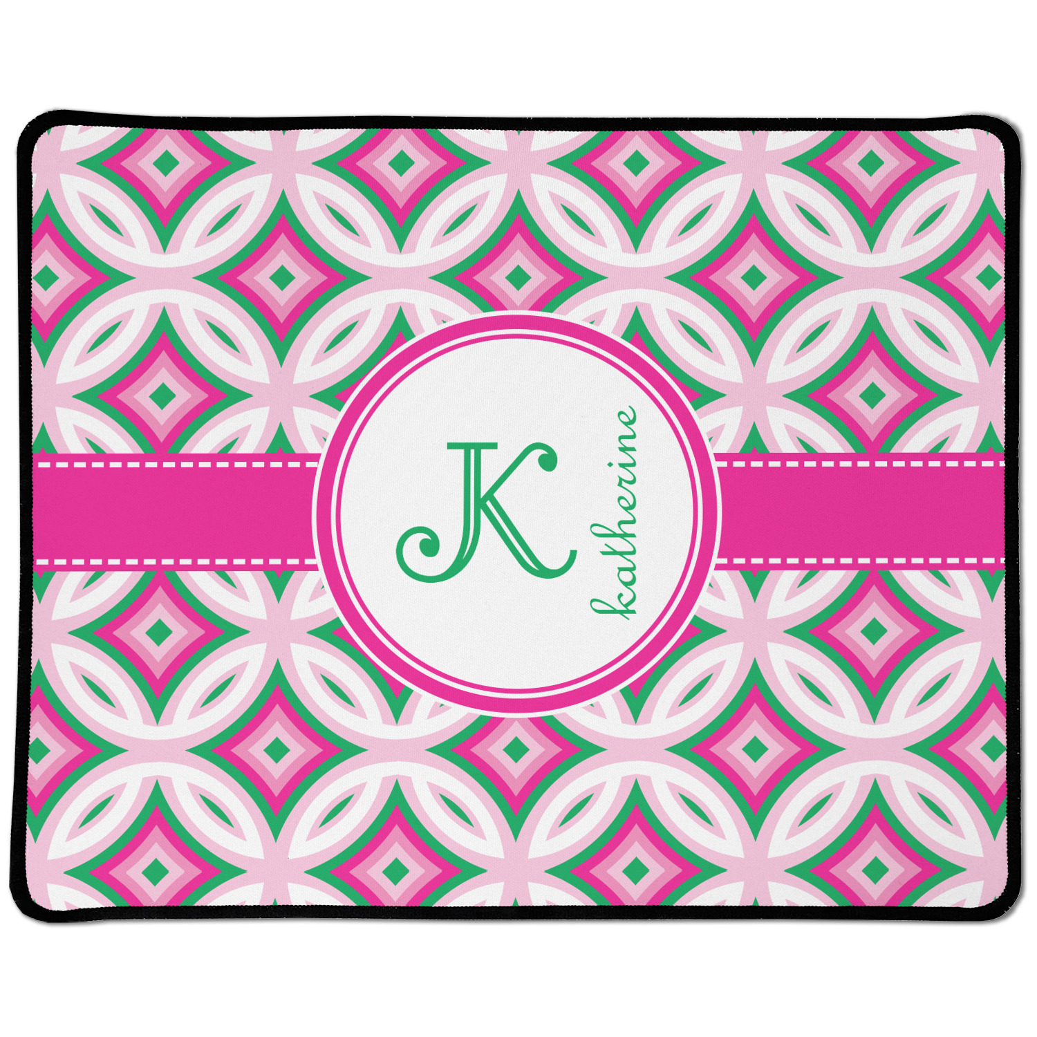 If you are looking for a design that is both girly and graphic, you will love Linked Circles & Diamonds Design. This design's color scheme is composed of light pink, hot pink, green and white. The pattern is exactly what the name implies circles and diamond intertwined through the whole design. Through the center there is label and ribbon shown in hot pink, but the color can be modified.
