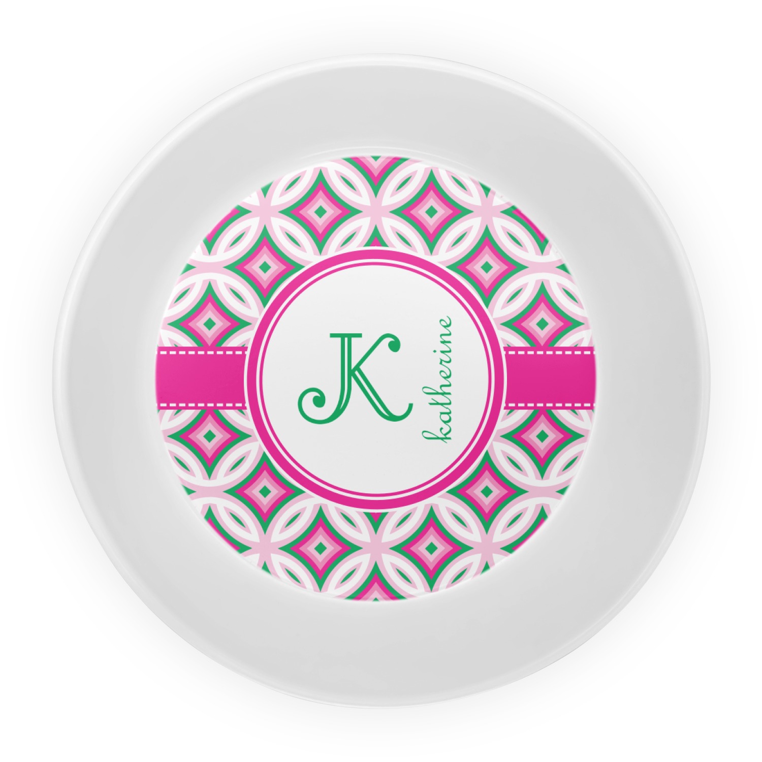 If you are looking for a design that is both girly and graphic, you will love Linked Circles & Diamonds Design. This design's color scheme is composed of light pink, hot pink, green and white. The pattern is exactly what the name implies circles and diamond intertwined through the whole design. Through the center there is label and ribbon shown in hot pink, but the color can be modified.