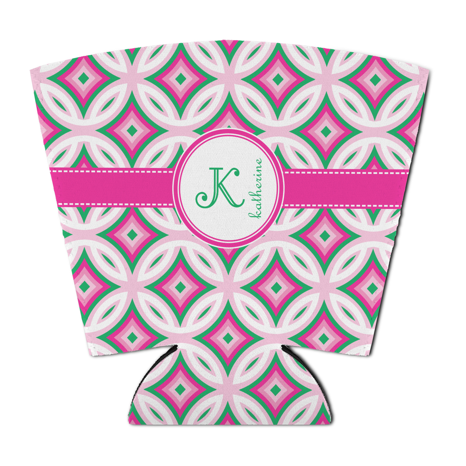 If you are looking for a design that is both girly and graphic, you will love Linked Circles & Diamonds Design. This design's color scheme is composed of light pink, hot pink, green and white. The pattern is exactly what the name implies circles and diamond intertwined through the whole design. Through the center there is label and ribbon shown in hot pink, but the color can be modified.