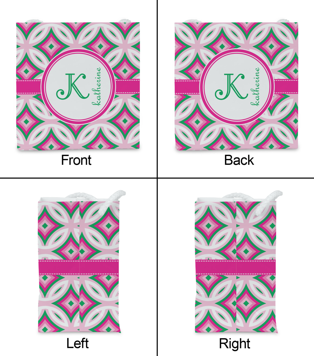 If you are looking for a design that is both girly and graphic, you will love Linked Circles & Diamonds Design. This design's color scheme is composed of light pink, hot pink, green and white. The pattern is exactly what the name implies circles and diamond intertwined through the whole design. Through the center there is label and ribbon shown in hot pink, but the color can be modified.