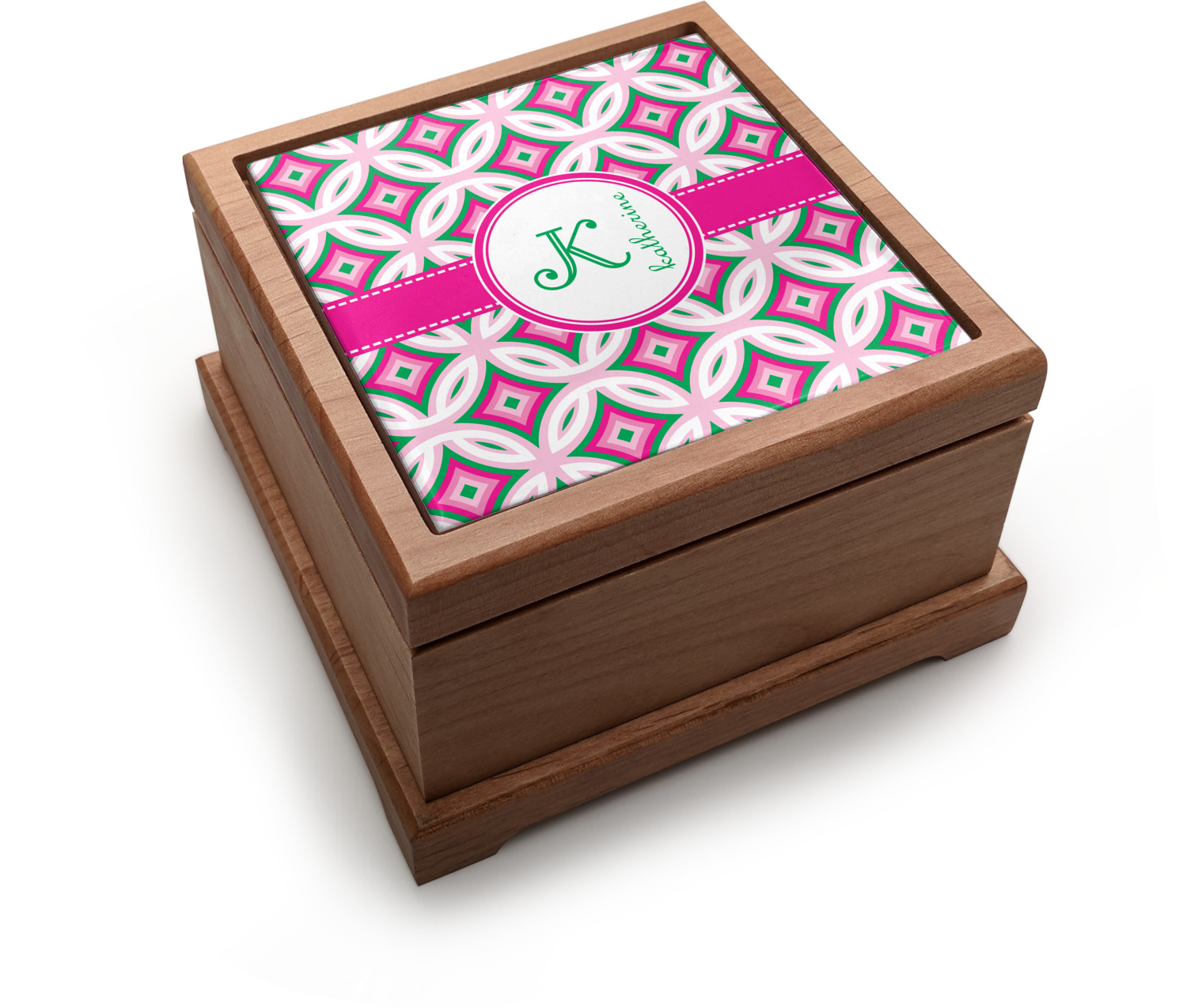 If you are looking for a design that is both girly and graphic, you will love Linked Circles & Diamonds Design. This design's color scheme is composed of light pink, hot pink, green and white. The pattern is exactly what the name implies circles and diamond intertwined through the whole design. Through the center there is label and ribbon shown in hot pink, but the color can be modified.