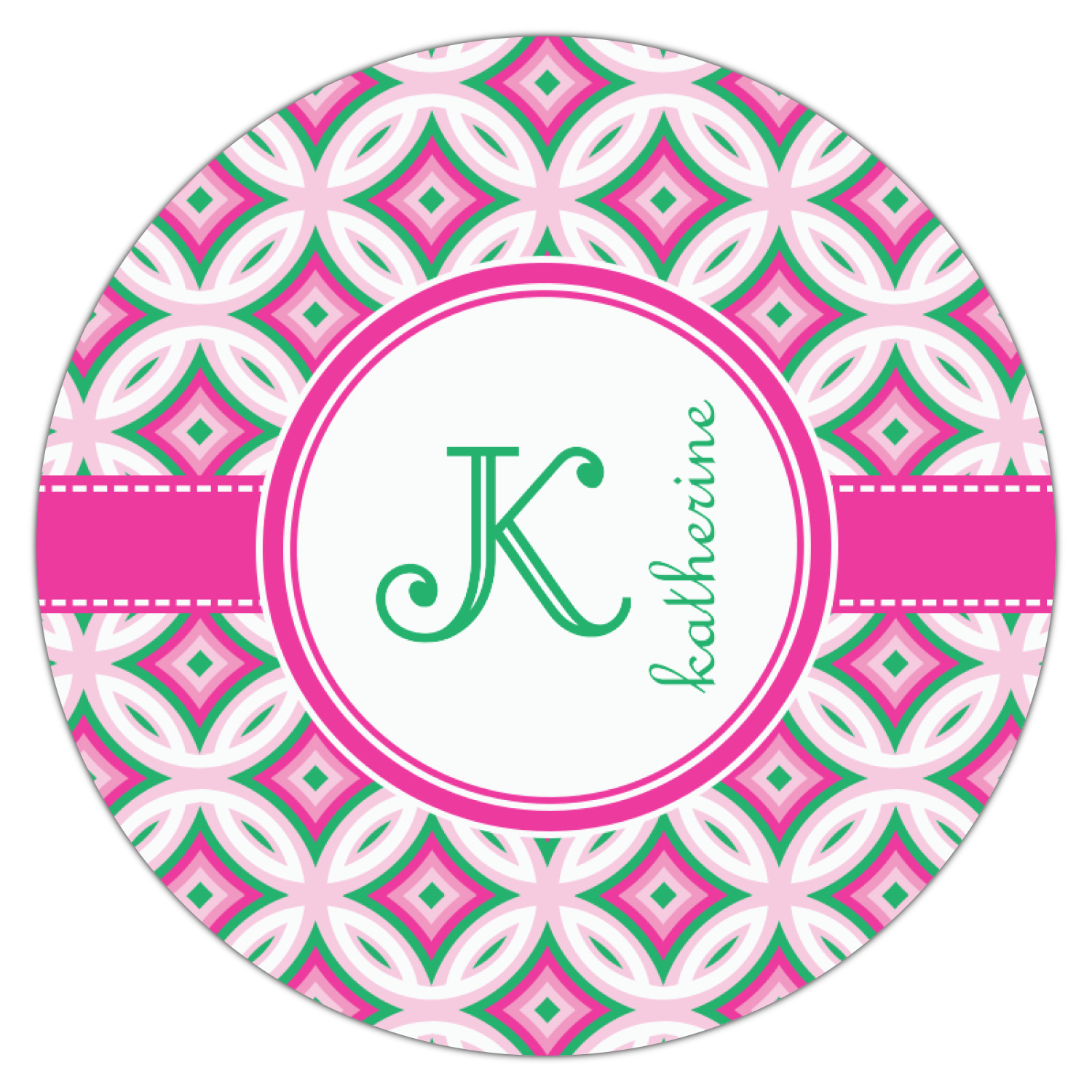 If you are looking for a design that is both girly and graphic, you will love Linked Circles & Diamonds Design. This design's color scheme is composed of light pink, hot pink, green and white. The pattern is exactly what the name implies circles and diamond intertwined through the whole design. Through the center there is label and ribbon shown in hot pink, but the color can be modified.