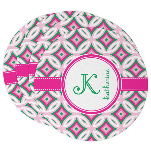 If you are looking for a design that is both girly and graphic, you will love Linked Circles & Diamonds Design. This design's color scheme is composed of light pink, hot pink, green and white. The pattern is exactly what the name implies circles and diamond intertwined through the whole design. Through the center there is label and ribbon shown in hot pink, but the color can be modified.