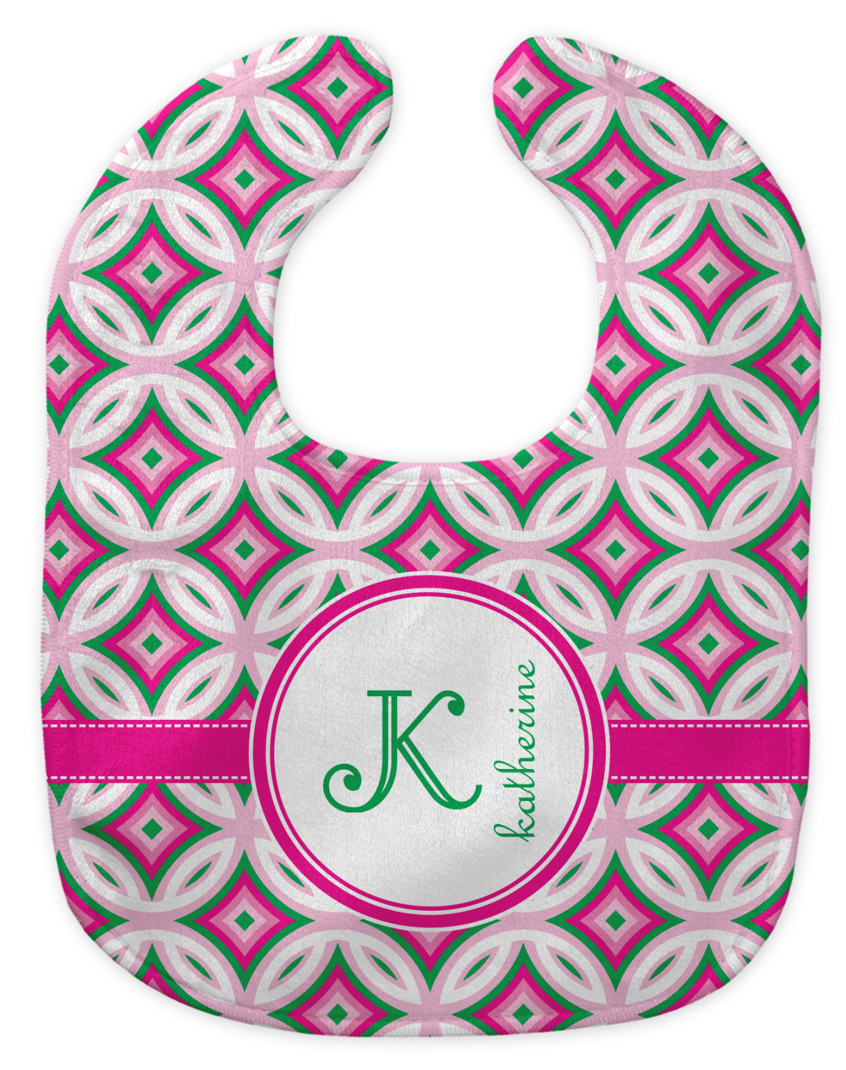 If you are looking for a design that is both girly and graphic, you will love Linked Circles & Diamonds Design. This design's color scheme is composed of light pink, hot pink, green and white. The pattern is exactly what the name implies circles and diamond intertwined through the whole design. Through the center there is label and ribbon shown in hot pink, but the color can be modified.