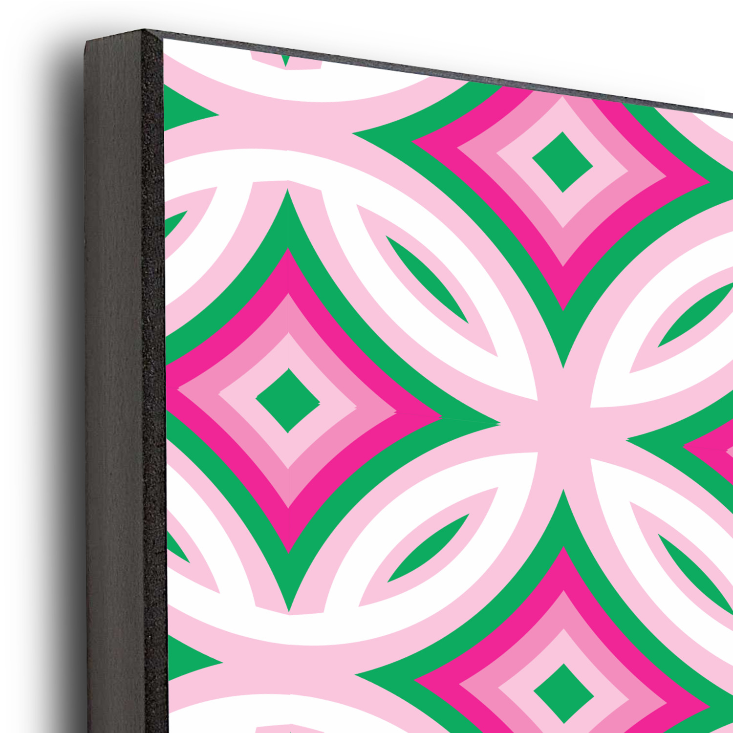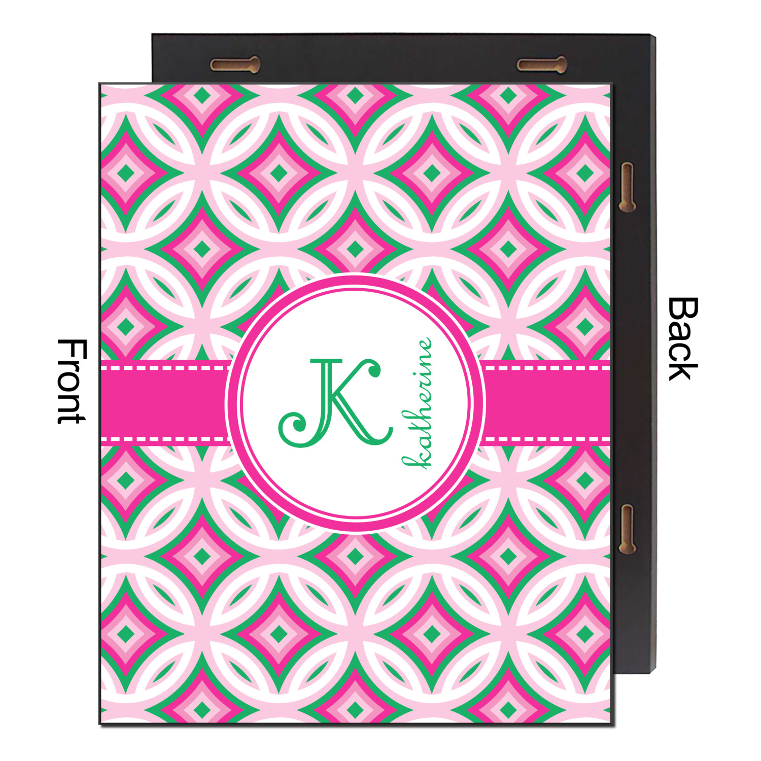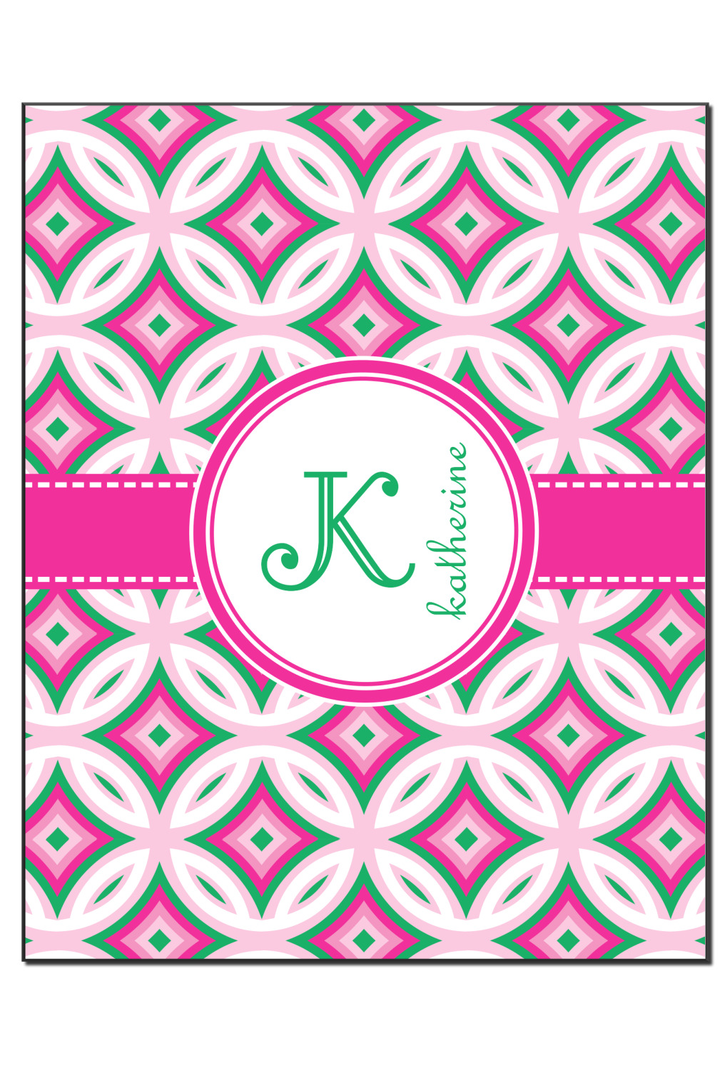 If you are looking for a design that is both girly and graphic, you will love Linked Circles & Diamonds Design. This design's color scheme is composed of light pink, hot pink, green and white. The pattern is exactly what the name implies circles and diamond intertwined through the whole design. Through the center there is label and ribbon shown in hot pink, but the color can be modified.