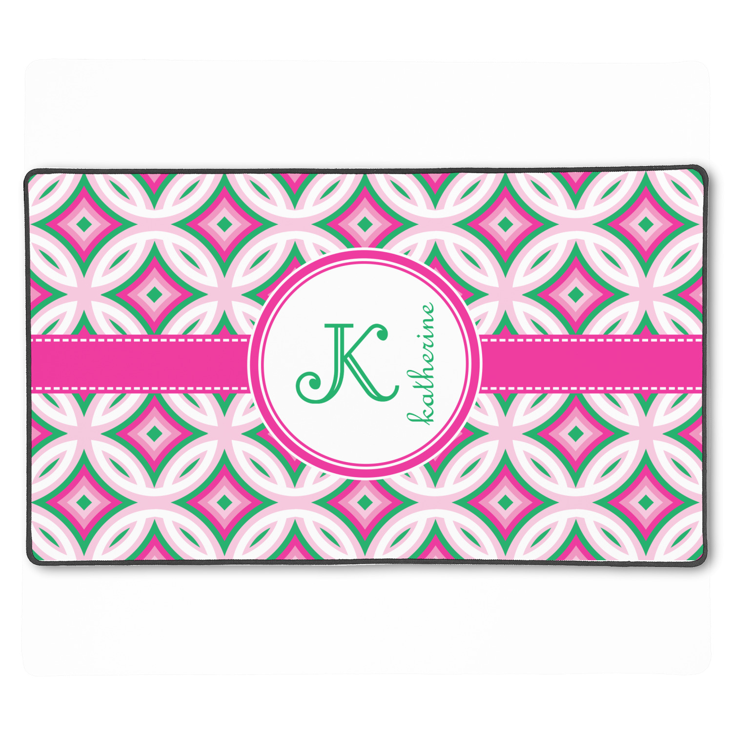 If you are looking for a design that is both girly and graphic, you will love Linked Circles & Diamonds Design. This design's color scheme is composed of light pink, hot pink, green and white. The pattern is exactly what the name implies circles and diamond intertwined through the whole design. Through the center there is label and ribbon shown in hot pink, but the color can be modified.