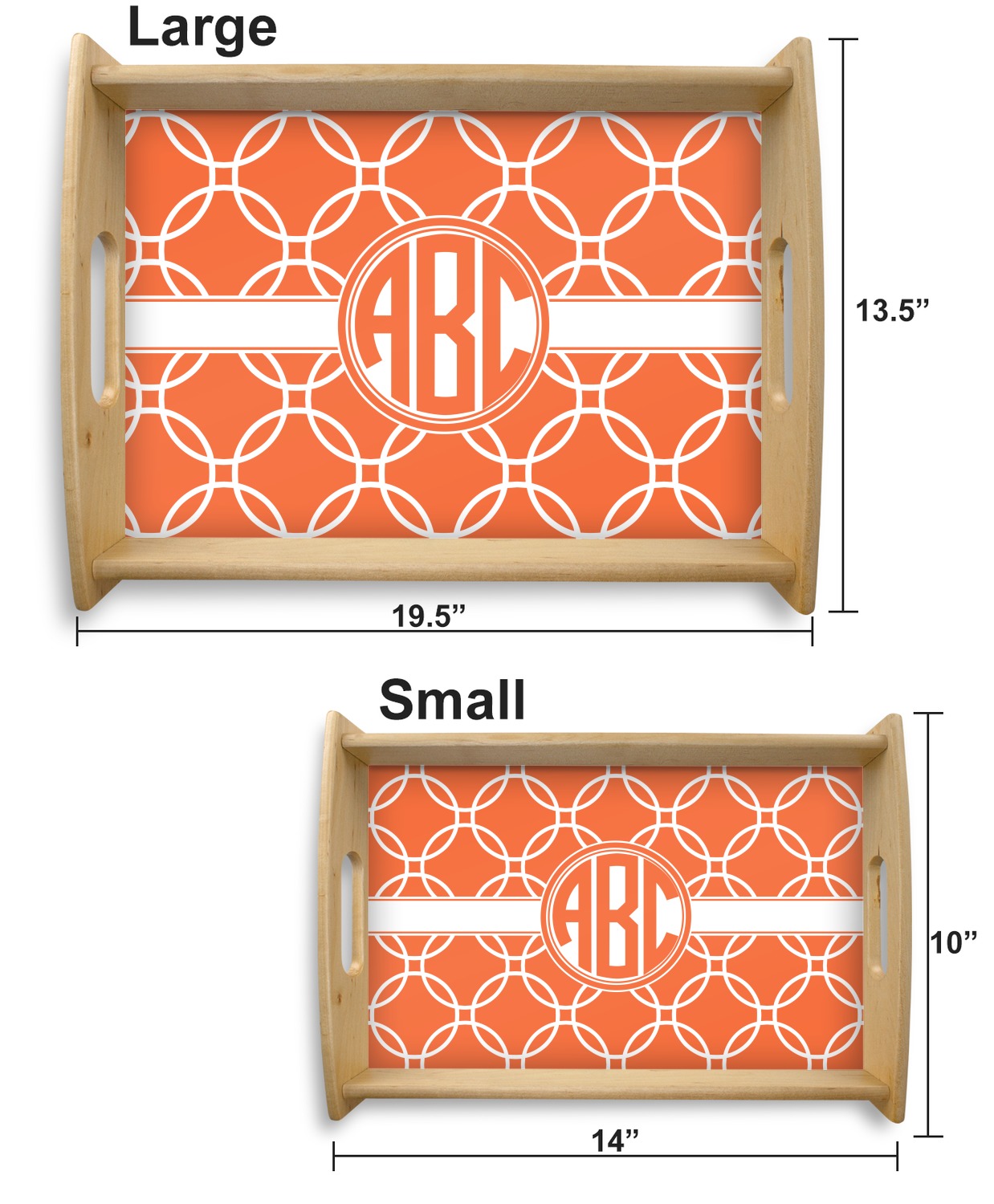 This serving tray with handles features square edges and two rounded sides, creating a very modern look. Each side is fabricated from a beautifully cut, natural wood. The bottom of the interior of the tray displays your customized design in bright, vibrant color. The tray is sold in both a black color and a natural wood look. Each variation of the wood serving tray has two sizes: Small, which is 14" x 10" x 2.25", and Large, which is 19.5" x 13.5" x 2.75".
