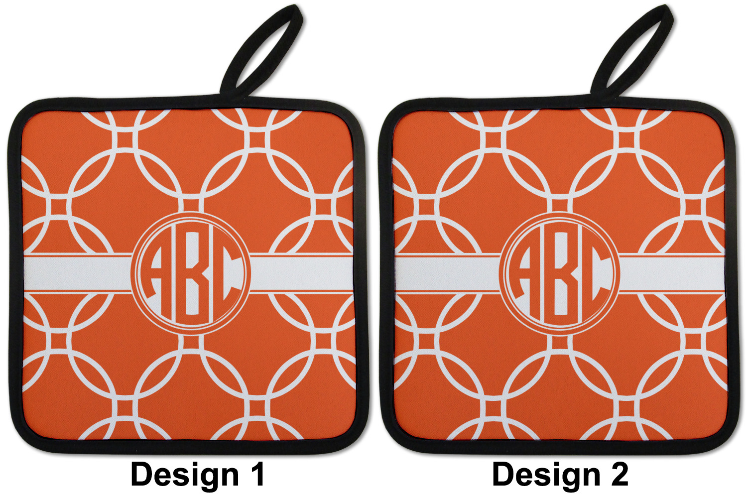 Our personalized pot holders feature a neoprene front that displays your personalization in vibrant colors. The backing of the hot pot holder is rubberized; the textured backing allows you to have a great grip when using this custom pot holder. The two materials are joined with a sleek, black trim, and the holder also includes an attached loop for hanging and storage. The pot holder is approximately 8.75 inches by 8.75 inches and 0.25 inches tall, while the fabric loop is 2.5 inches long. You can purchase a kitchen pot holder by itself or as a set of 2. We also offer a set including one pot holder and one oven mitt.