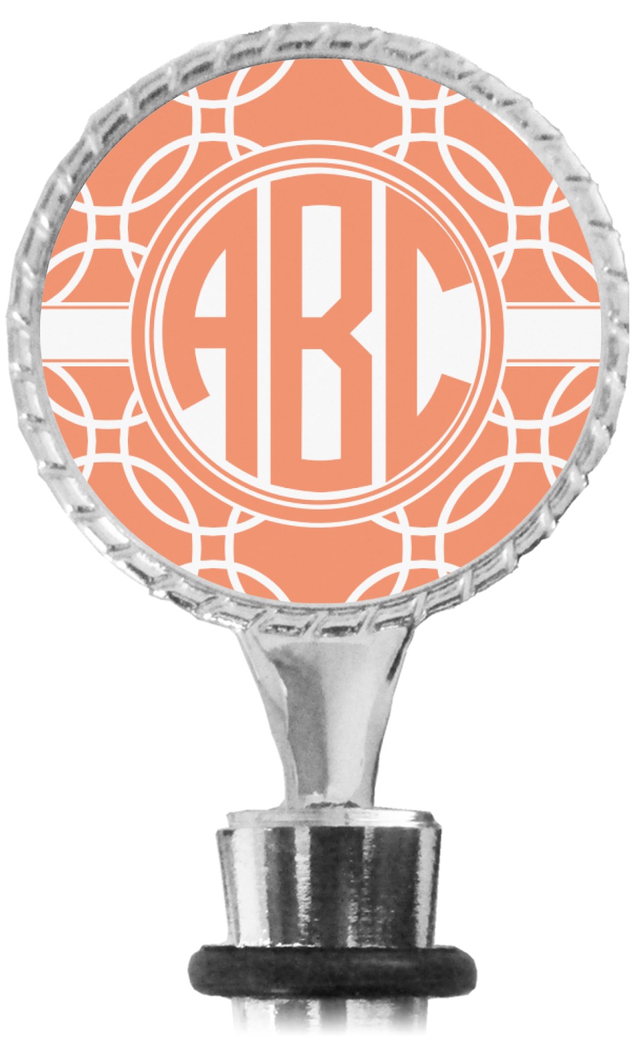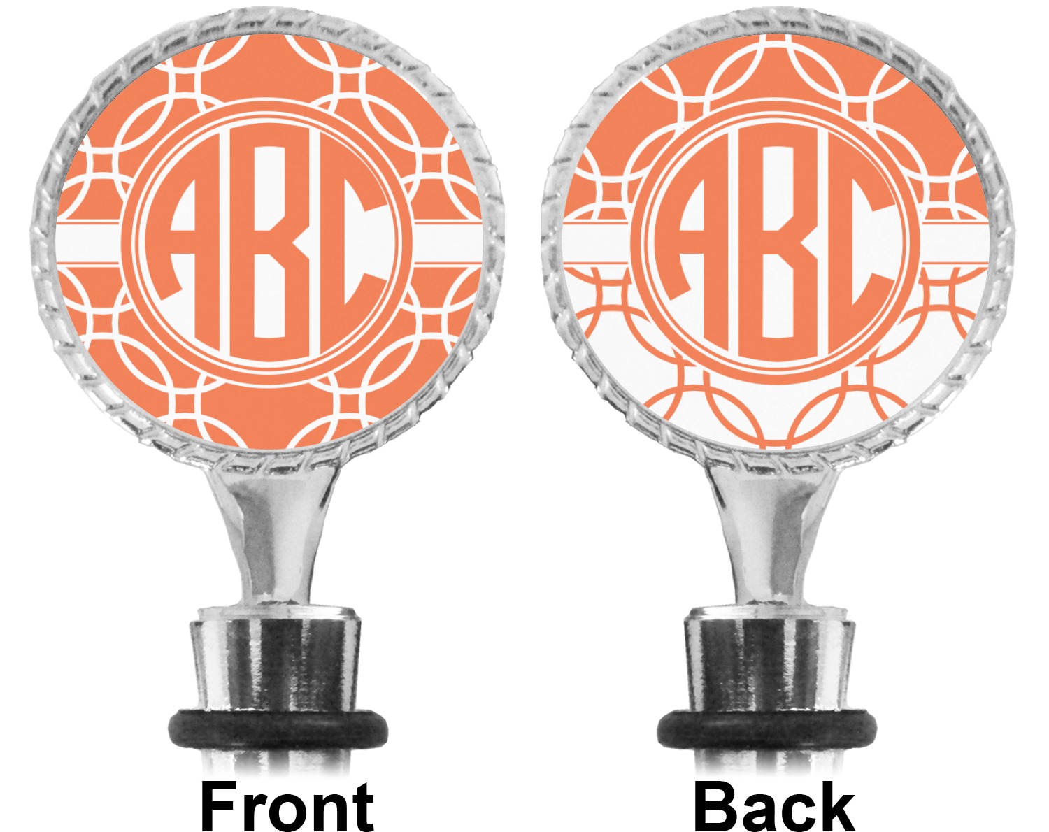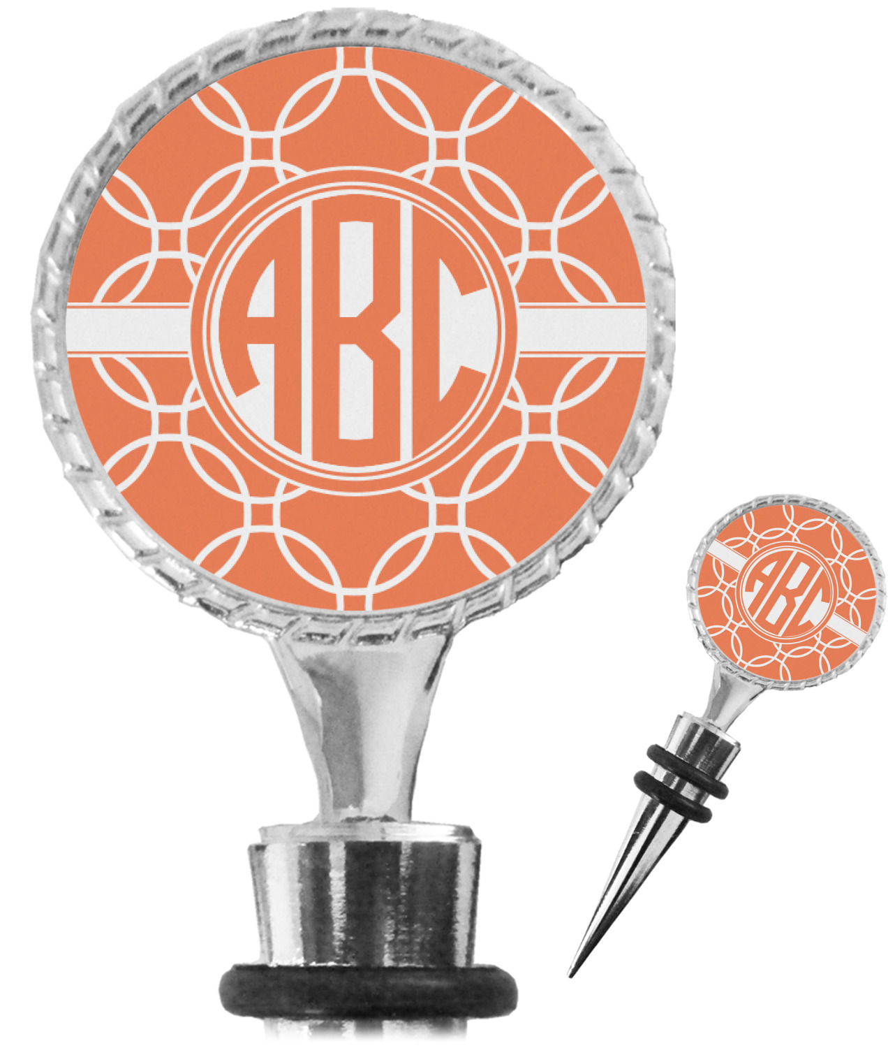 The top part of your bottle stopper is comprised of a zinc ring that displays your customization(s) in its middle, on both sides. The ring is heavy duty, with a bright chrome finish. The body of the wine stoppers have two silicone rings to provide an airtight seal. These wine bottle stoppers measure at 1.625" L x 0.8125" W x 4.625" H; your custom wine stopper is meant to fit into most standard-sized wine bottles.