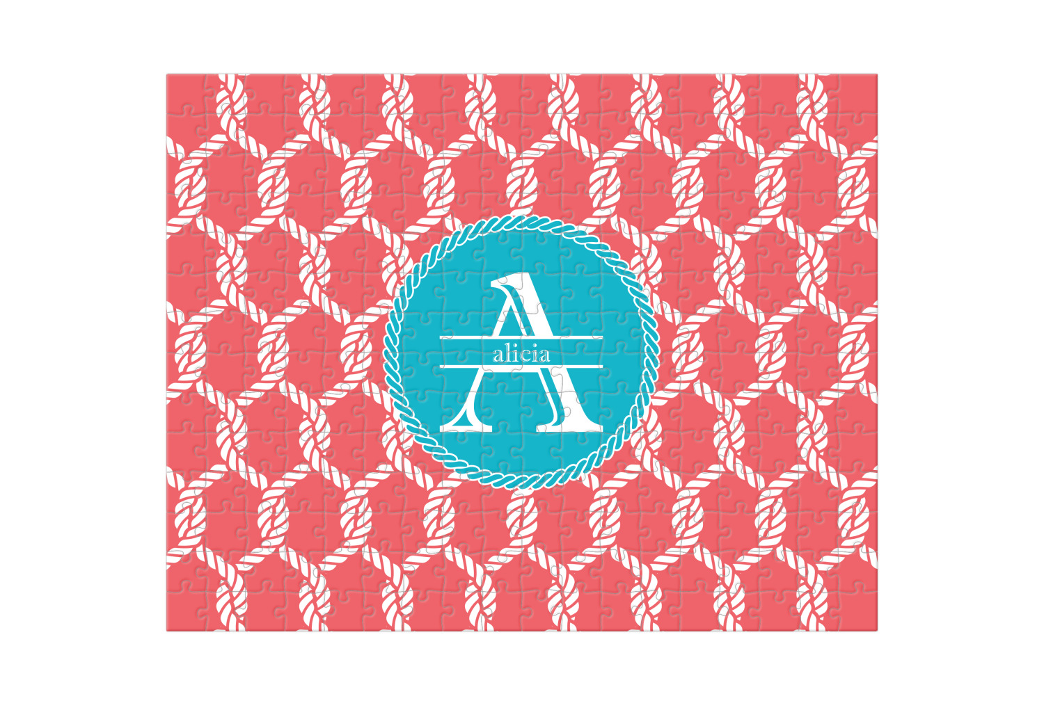 This linked ropes design is perfect for your real or dream beach house. The nautical design has ropes linked together to form diamonds. We have chosen a coral and teal palette for our design. We also chose a rope label and a name initial combination for our personalization.