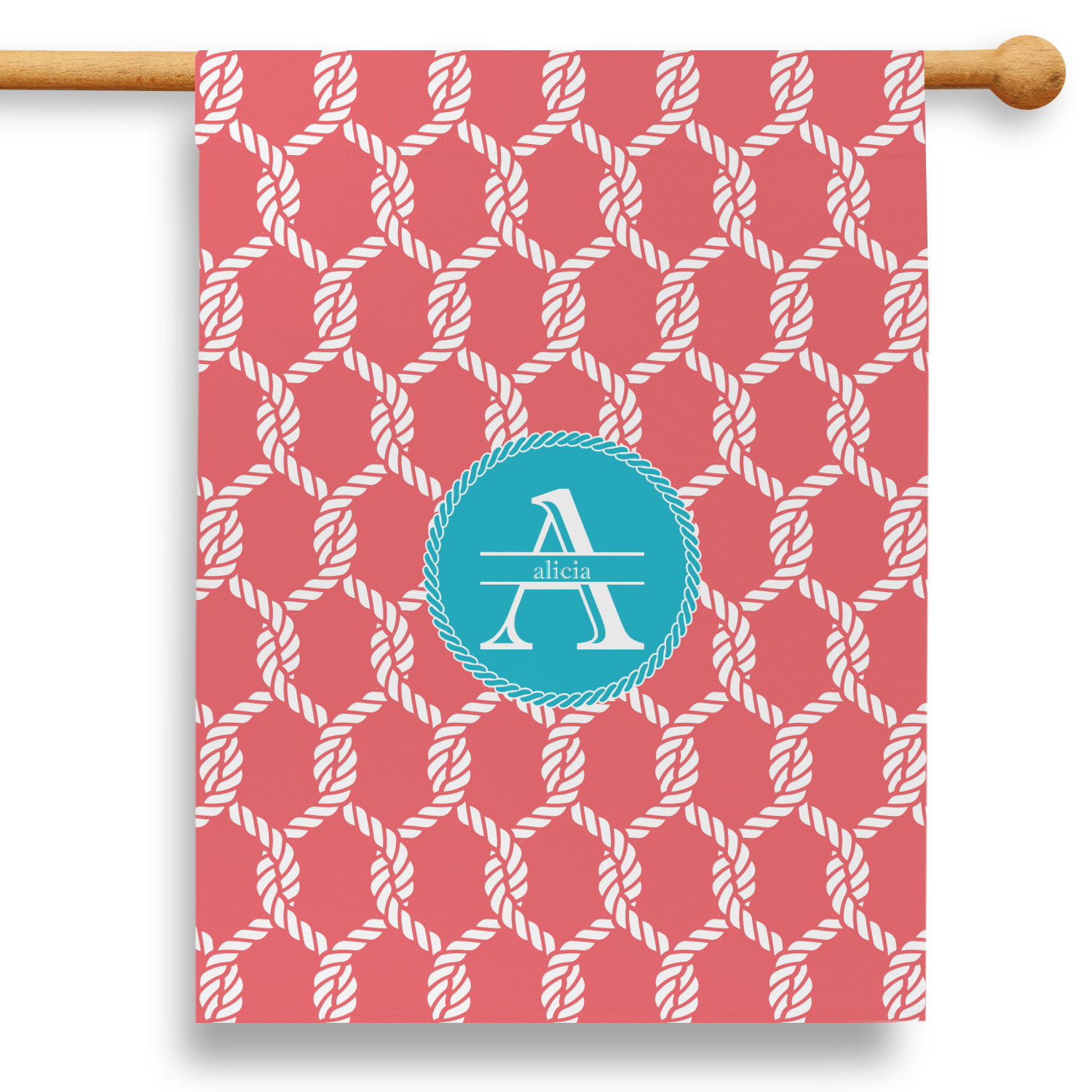 This linked ropes design is perfect for your real or dream beach house. The nautical design has ropes linked together to form diamonds. We have chosen a coral and teal palette for our design. We also chose a rope label and a name initial combination for our personalization.