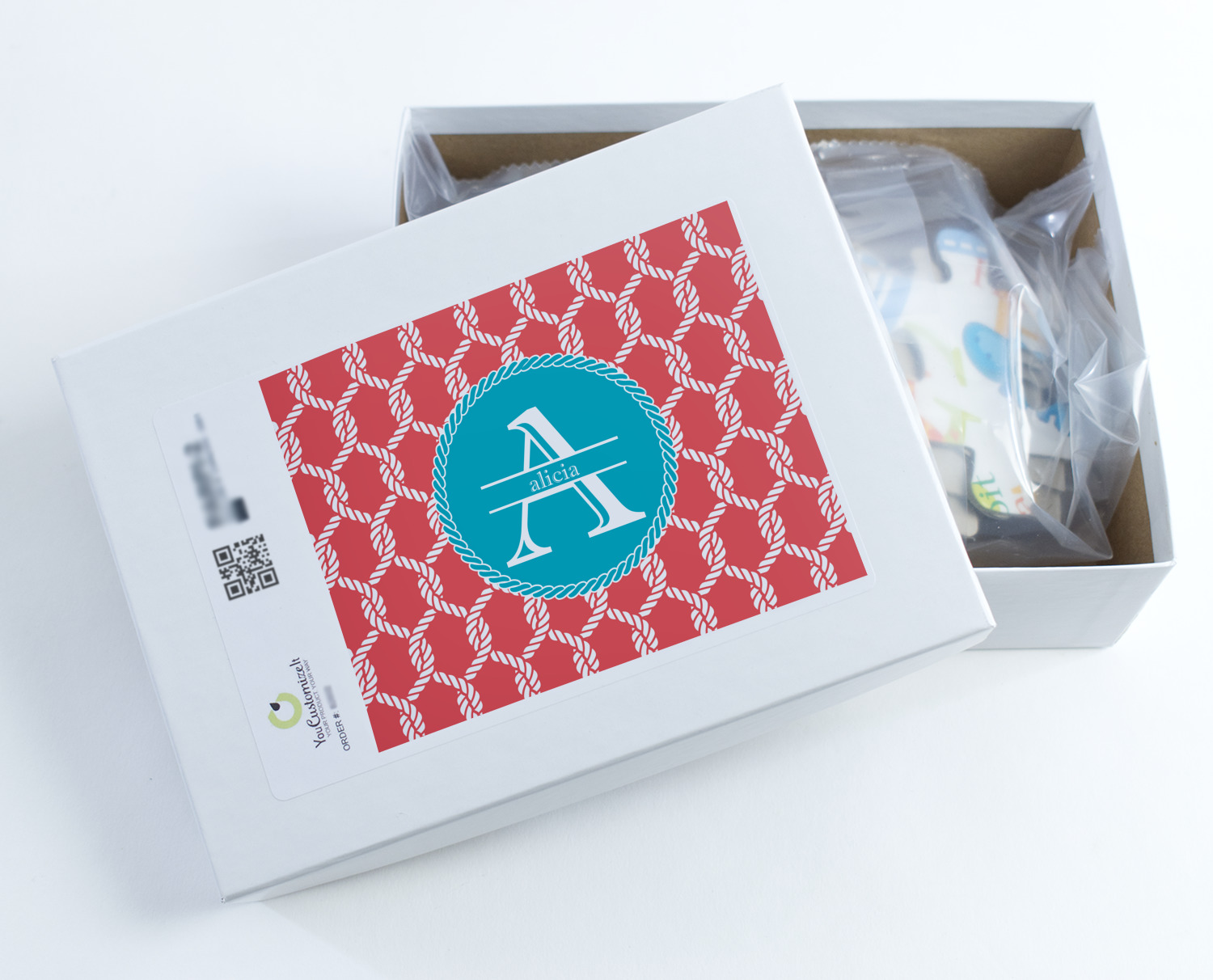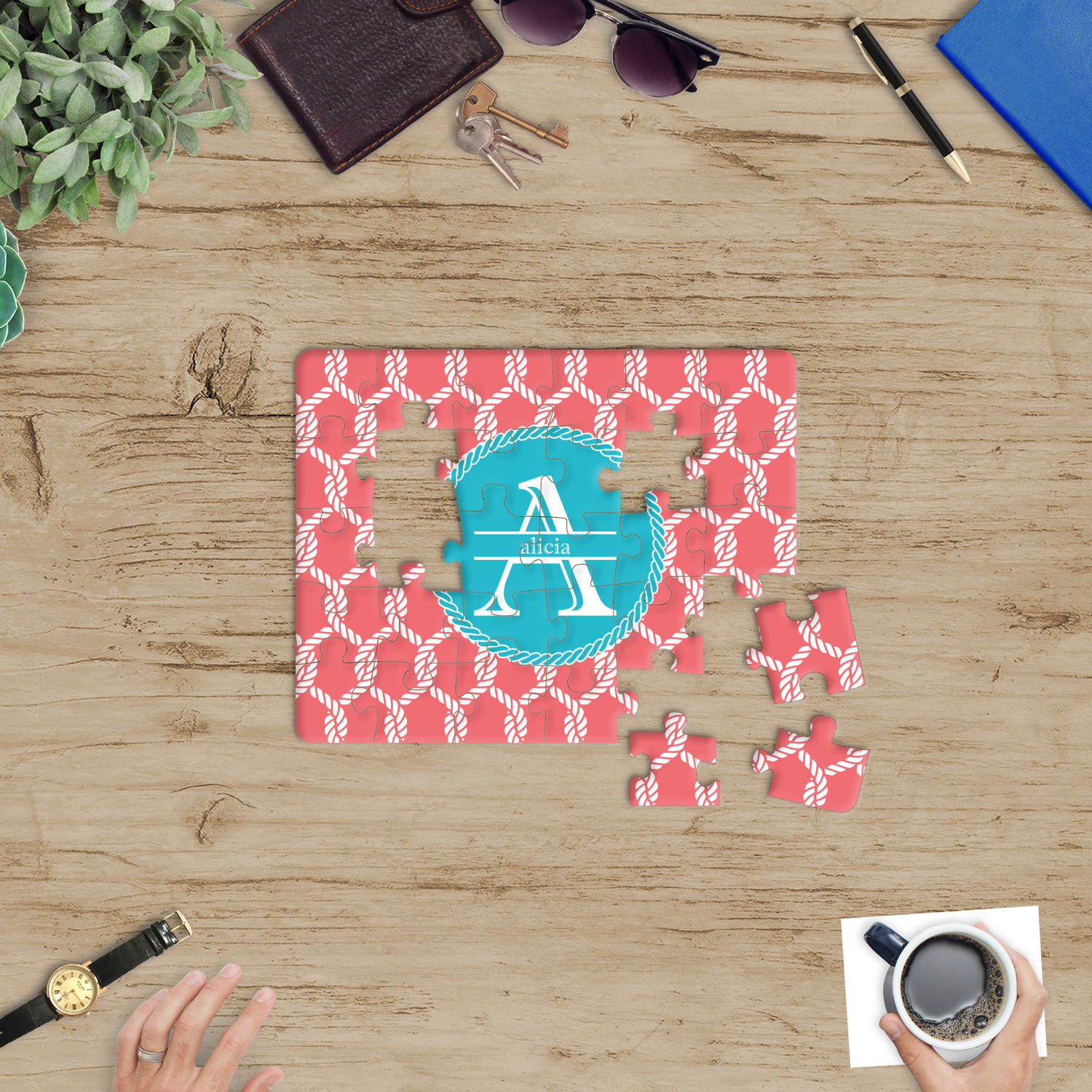 This linked ropes design is perfect for your real or dream beach house. The nautical design has ropes linked together to form diamonds. We have chosen a coral and teal palette for our design. We also chose a rope label and a name initial combination for our personalization.
