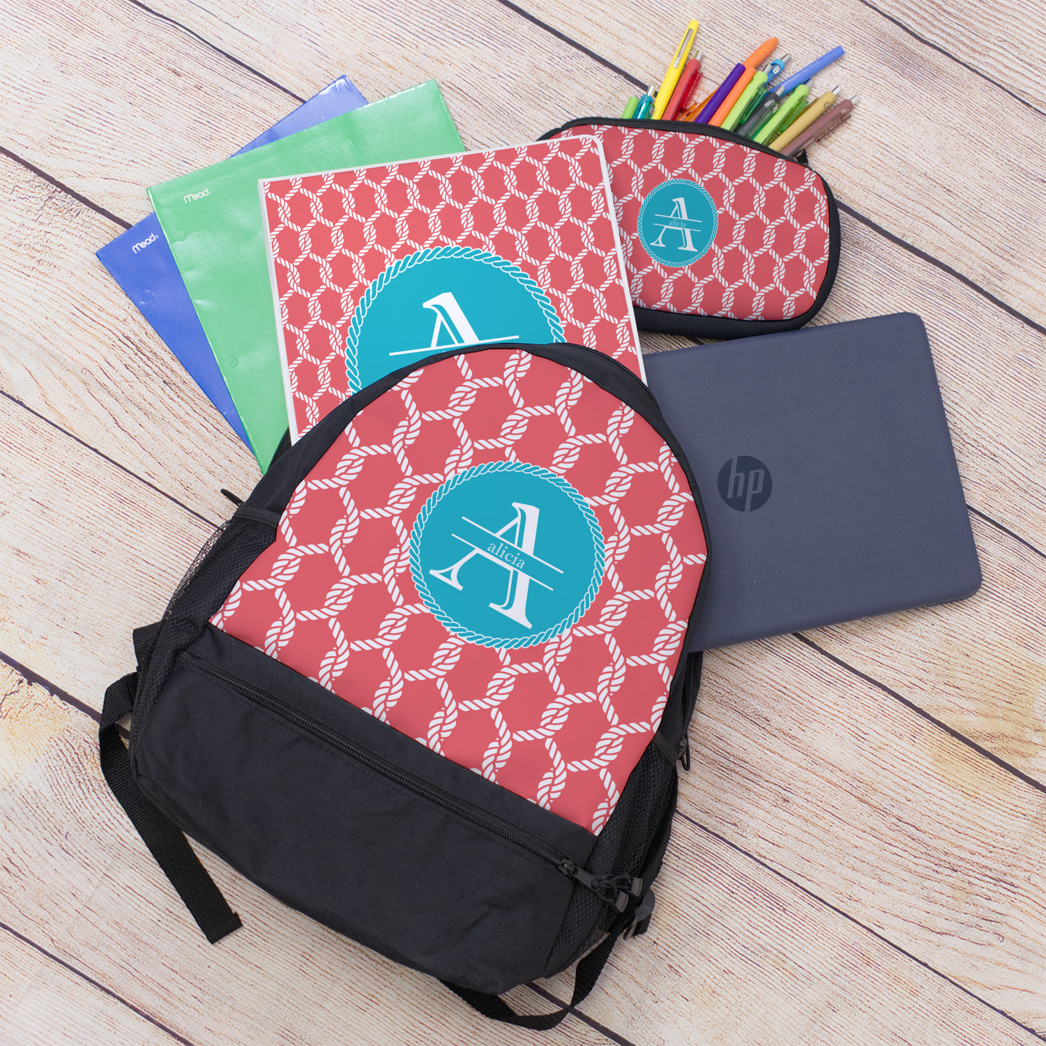 This linked ropes design is perfect for your real or dream beach house. The nautical design has ropes linked together to form diamonds. We have chosen a coral and teal palette for our design. We also chose a rope label and a name initial combination for our personalization.