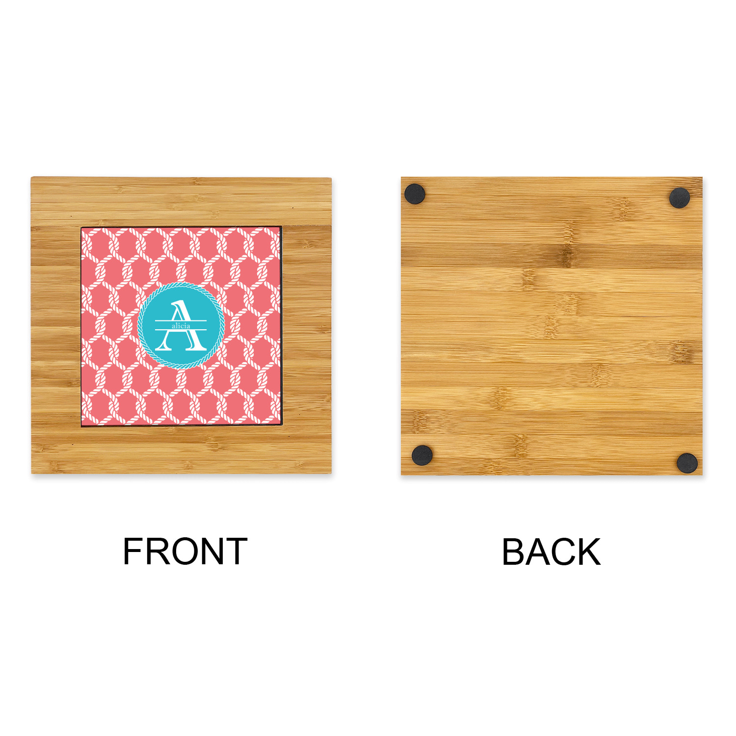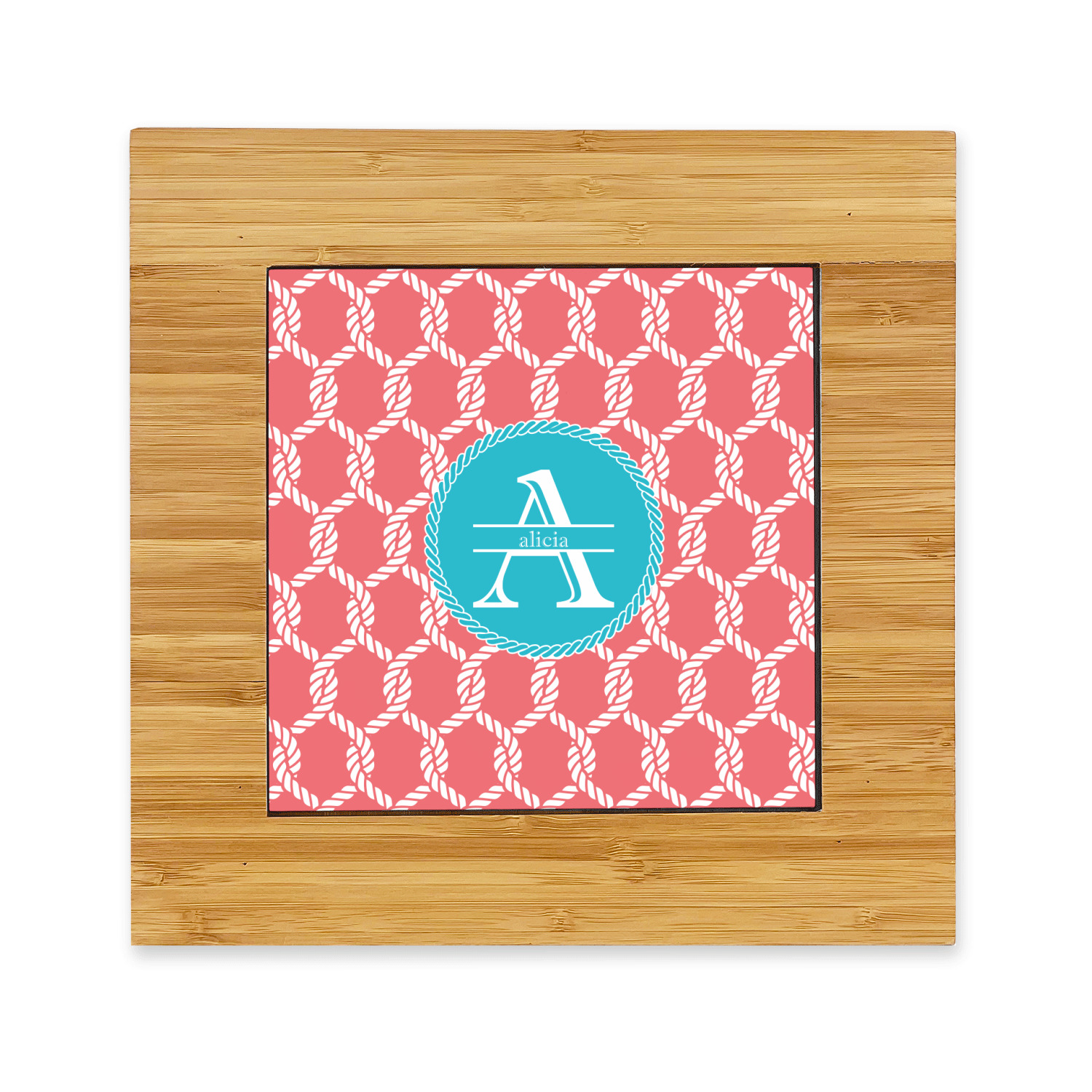 This linked ropes design is perfect for your real or dream beach house. The nautical design has ropes linked together to form diamonds. We have chosen a coral and teal palette for our design. We also chose a rope label and a name initial combination for our personalization.