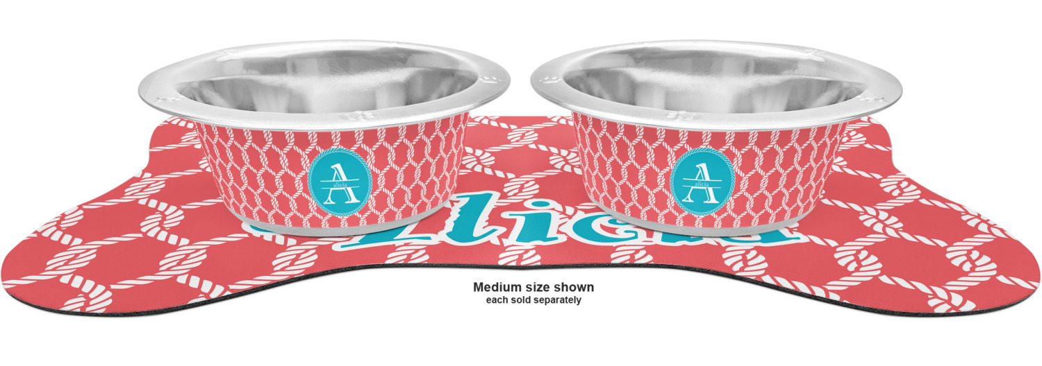 The top of this mat displays your custom design, as it is printed on polyester. To prevent slippage, the underside of the mat is made of rubber. We offer a small dog food mat, suitable for smaller dogs and a large dog food mat for bigger breeds. The small dog food mat is approximately 19 by 13 inches, while the large dog feeding mat measures at approximately 26.75 by 18 inches. Both personalized mats are ideally sized to fit two dog bowls.