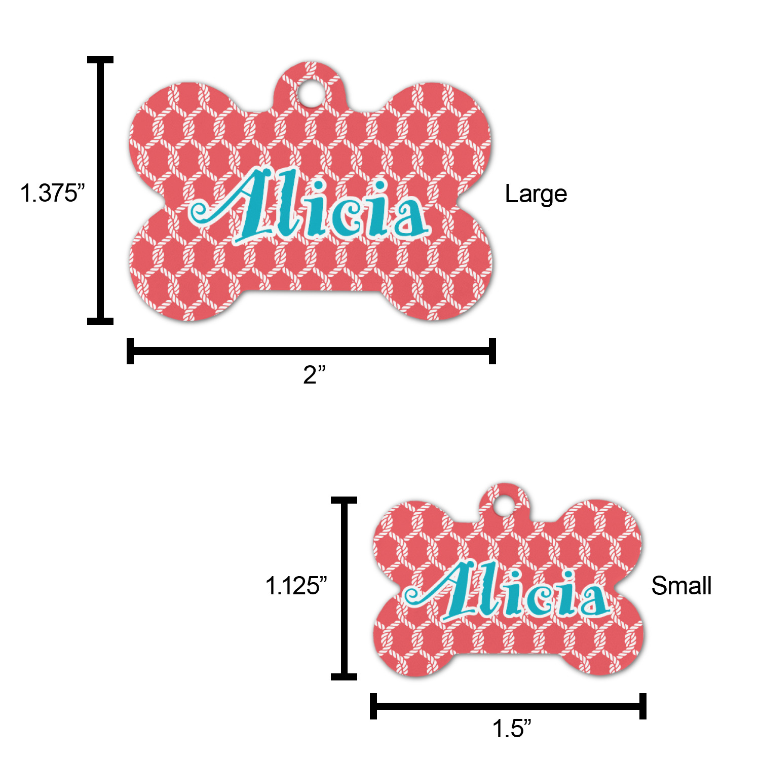 The small bone dog tag size is perfect to pair with our small dog collars, the large size pairs well with our large dog collars.