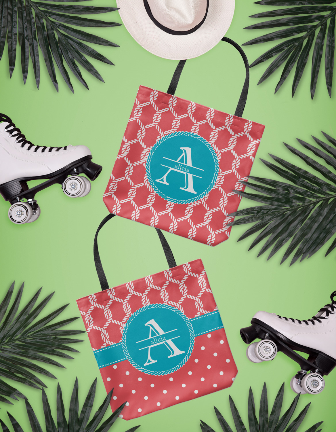 This linked ropes design is perfect for your real or dream beach house. The nautical design has ropes linked together to form diamonds. We have chosen a coral and teal palette for our design. We also chose a rope label and a name initial combination for our personalization.