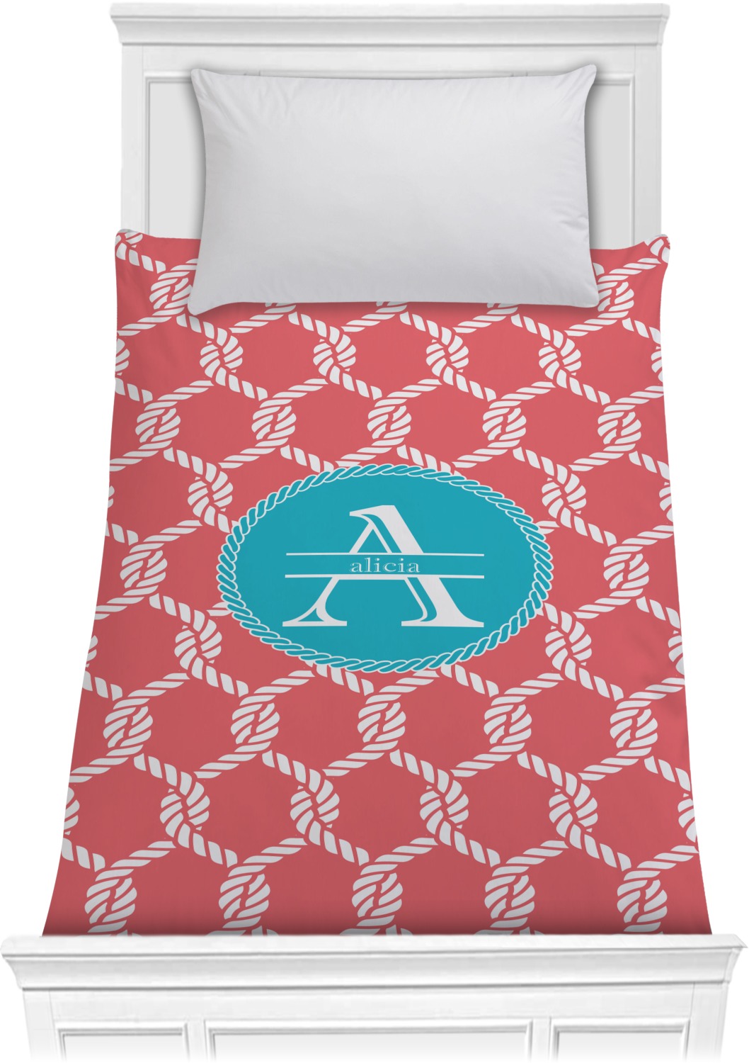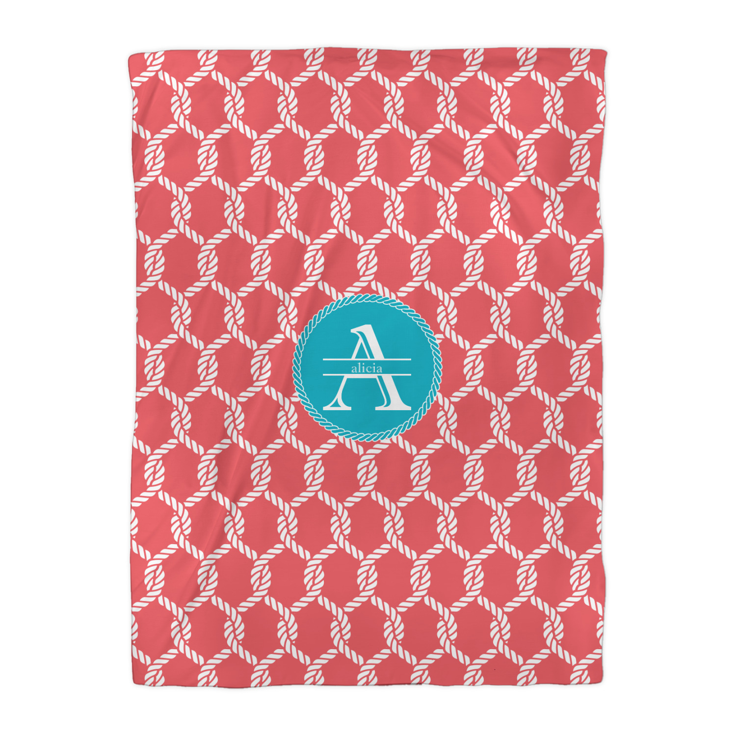 This linked ropes design is perfect for your real or dream beach house. The nautical design has ropes linked together to form diamonds. We have chosen a coral and teal palette for our design. We also chose a rope label and a name initial combination for our personalization.