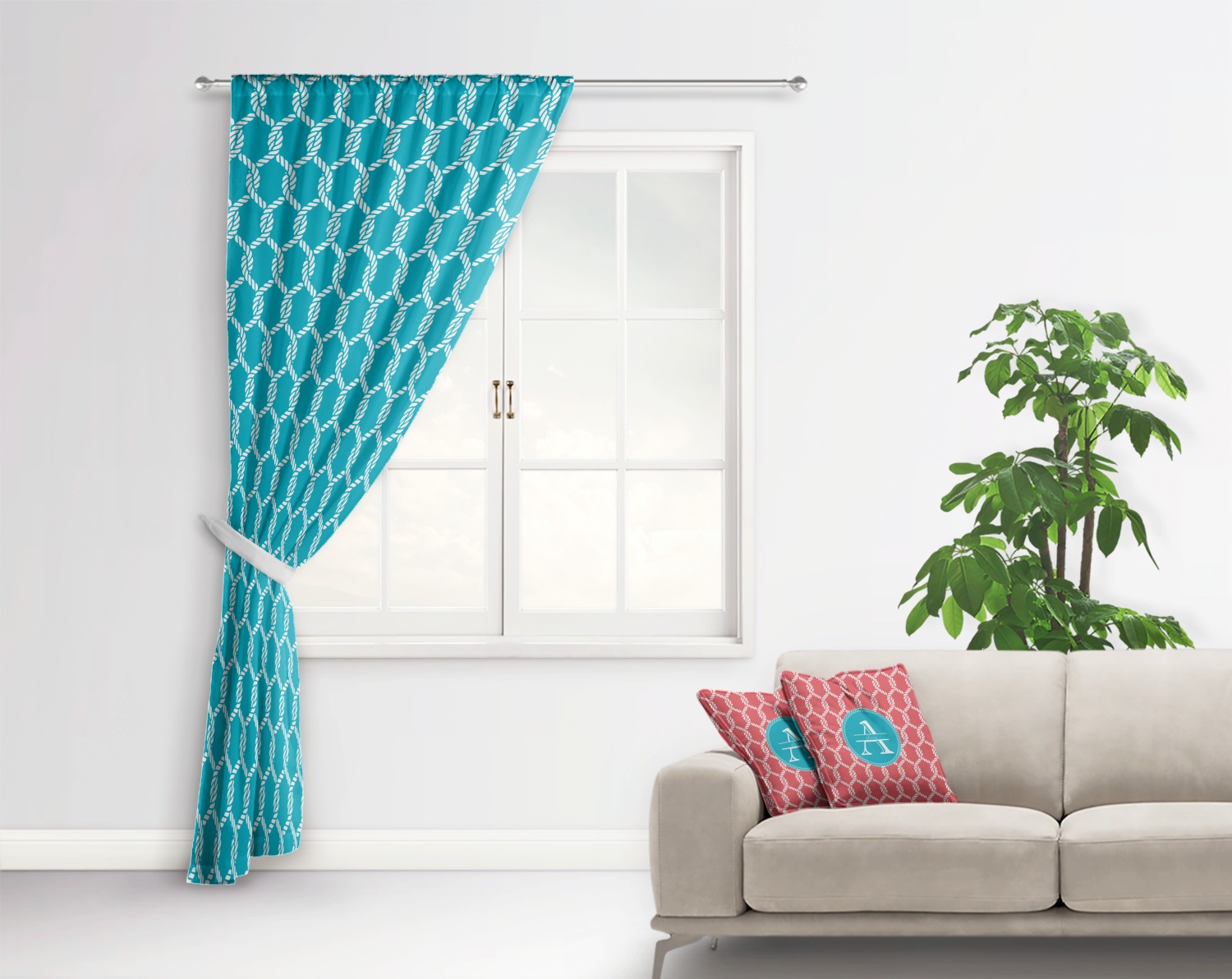 This linked ropes design is perfect for your real or dream beach house. The nautical design has ropes linked together to form diamonds. We have chosen a coral and teal palette for our design. We also chose a rope label and a name initial combination for our personalization.